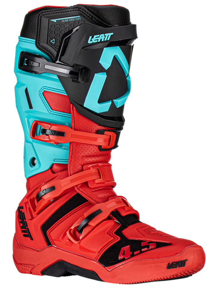 Buty Leatt 4.5 to obuwie motocyklowe, które świetnie się sprawdzi w wycieczkach motocyklowych terenowych z naciskiem na enduro. Wnętrze buta wykonane jest z oddychającej siatki 3D z antypoślizgowym wykończeniem utrzymującym piętę na swoim miejscu zapobiegając efektowi ślizgania się nogi. Za bezpieczeństwo odpowiada system SlideLock który automatycznie blokuje klamrę górną w bucie świetnie uszczelniając i stabilizując nogę. Dużym atutem butów jest niewątpliwie system zamykania, składający się z klamer wykonanych z kompozytu polimerowego oraz wyżej wspomnianego systemu SlideLock. Twarda podeszwa DualZone oraz niski profil gwarantują wysoką wygodę podczas zmiany biegów, wspomagają styl jazdy "na palcach" oraz niwelują wibracje powstałe podczas jazdy. Certyfikowane zgodnie z normą EN 13634:2017 potwierdzają spełnienie europejskich standardów bezpieczeństwa.