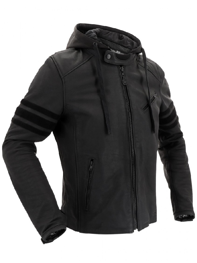 Skórzana kurtka motocyklowa Toulon Black Edition to świetnie prezentujący się model, który wykorzystasz zarówno podczas jazdy motocyklem, jak i po zejściu z niego. Do uszycia kurtki wykorzystano czarną skórę bydlęcą, która odznacza się wysoką jakością oraz doskonałą odpornością na ścieranie i przetarcie. Wnętrze kurtki wyściełane jest komfortową bawełnianą podszewką vintage. Obszary o zwiększonym ryzyku uszkodzenia wzmocniono bezpiecznymi szwami. Jako kurtka ochronna posiada komplet certyfikowanych ochraniaczy D3O® na poziomie 1. Ochraniacze te znajdują się na łokciach, ramionach oraz plecach. Poziom ochrony możesz zwiększyć, zakładając opcjonalne ochraniacze na poziomie 2. Atrakcyjność kurtki zwiększa odpinany kaptur z możliwością regulacji. Zapewnia on dodatkową ochronę głowy w razie niepogody. Komfort użytkowania kurtki zwiększa neoprenowe wykończenie kołnierza i mankietów, które jest niezwykle przyjemne dla skóry. Patka pod szyją wyposażona jest w osłonę podbródka. Rękawy posiadają zamki, które ułatwiają zakładanie i zdejmowanie kurtki. Z kolei napy w pasie pozwalają na indywidualne dopasowanie kurtki do sylwetki. Do dyspozycji masz kilka kieszeni zewnętrznych i wewnętrznych, które pomieszczą niezbędne podczas jazdy osobiste rzeczy. Za pomocą krótkiego zamka połączysz model Toulon Black Edition z polecanymi spodniami motocyklowymi.