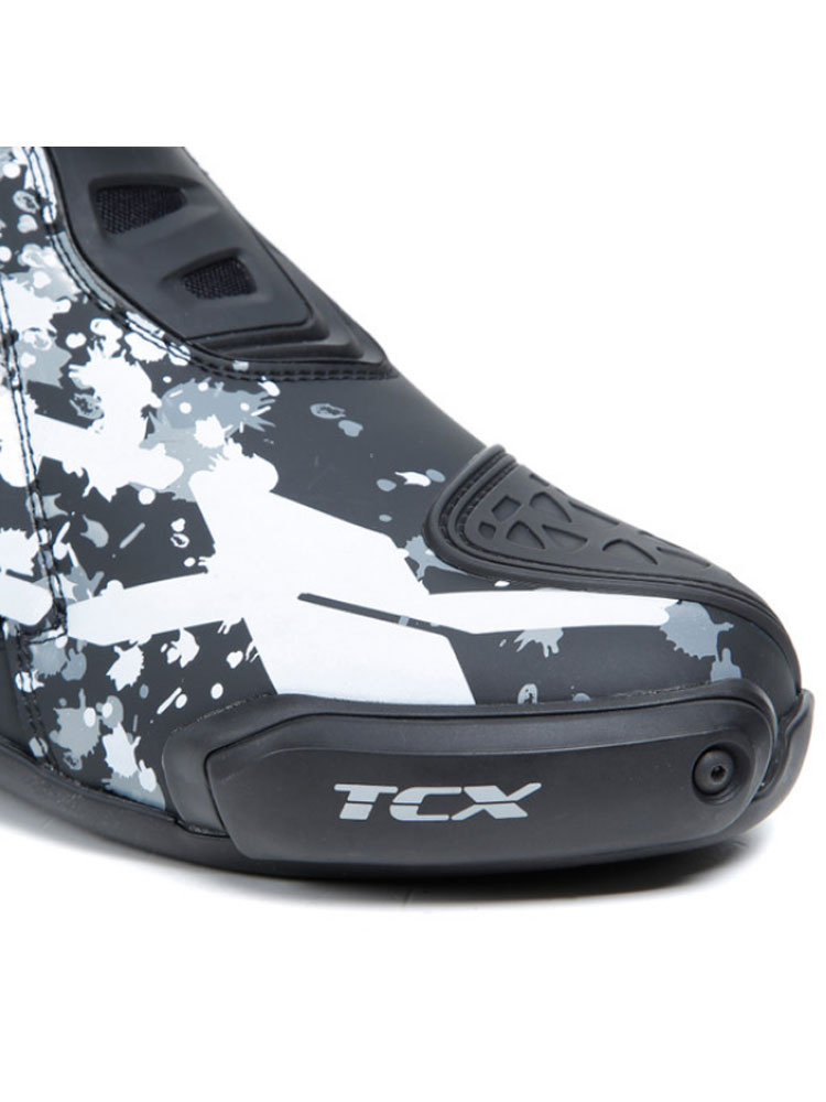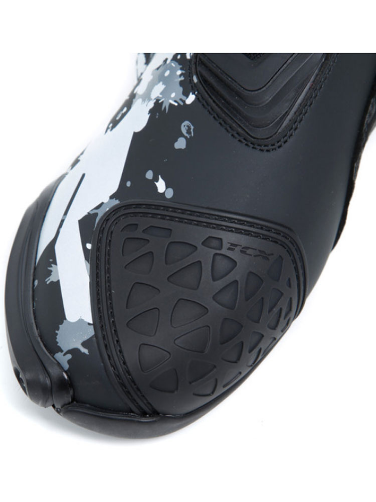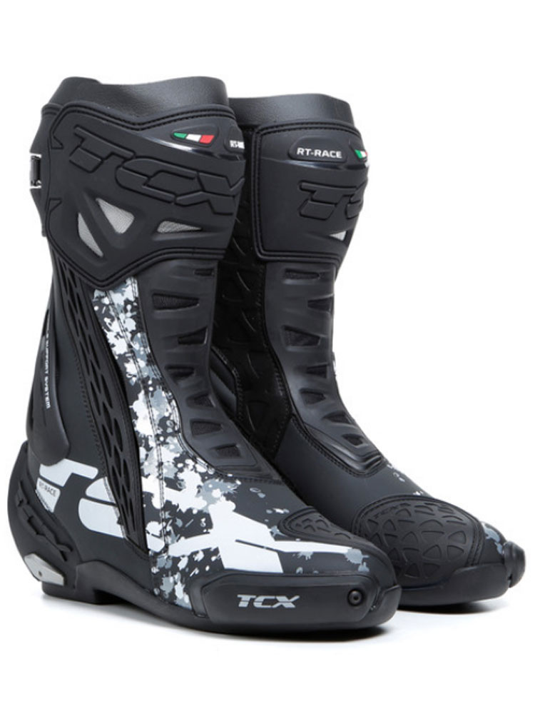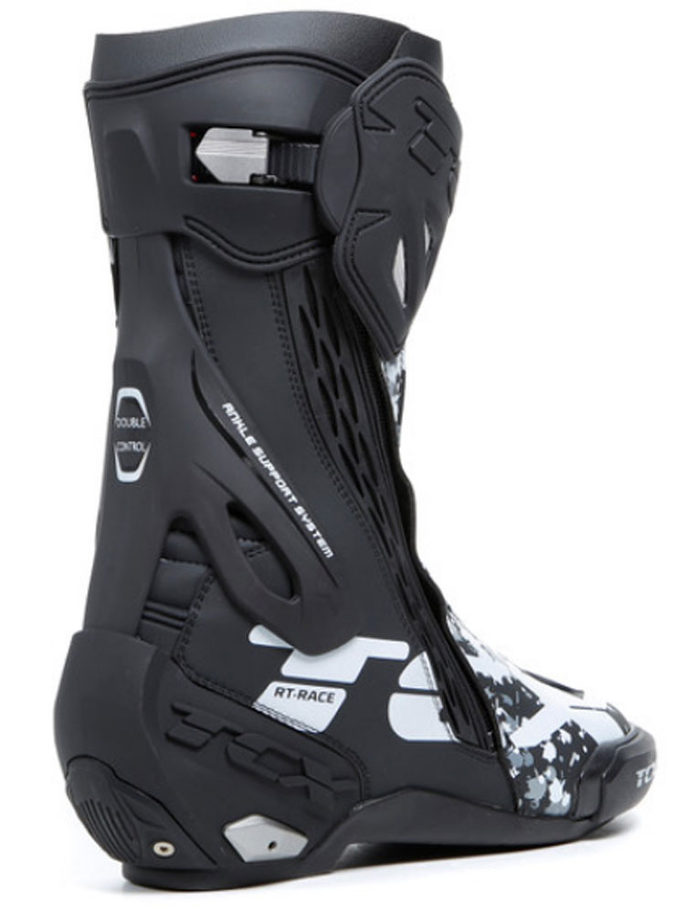 TCX RT-Race to lekkie i eleganckie buty motocyklowe zaprojektowane z myślą o zapewnieniu wyjątkowego bezpieczeństwa oraz kontroli nad motocyklem. Utrzymane są w stylowym i agresywnym sportowym designie. Cholewka buta wykonana jest z odpornej na przetarcia mikrofibry, a wewnętrzna podszewka z siateczkowej tkaniny Air-Tech, która umożliwia swobodny przepływ powietrza. Ma to spory wpływ na szybkie i sprawne odprowadzanie wilgoci. Wkładka Ortholite® absorbuje drgania powstałe podczas jazdy. Model ten zawiera technologię Fasten Fit Control, wewnętrzny system sznurowania połączony z wyściółką buta, dzięki czemu cholewka świetnie dopasowuje się do kształtu łydki motocyklisty. RT-Race zapinane są również na zamek błyskawiczny przytwierdzony do elastycznego panelu. Za bezpieczeństwo odpowiada system Double Flex Control, który chroni staw skokowy poprzez ograniczenie jego ruchu w momencie nadwyrężenia. Dodatkowo obszar pięt, kostek i łydki wzmocniony jest ochraniaczami absorbującymi energię podczas ewentualnego kontaktu z nawierzchnią. Slider w przedniej części cholewki wykonany został z poliuretanu. W razie zużycia możliwa jest jego wymiana.