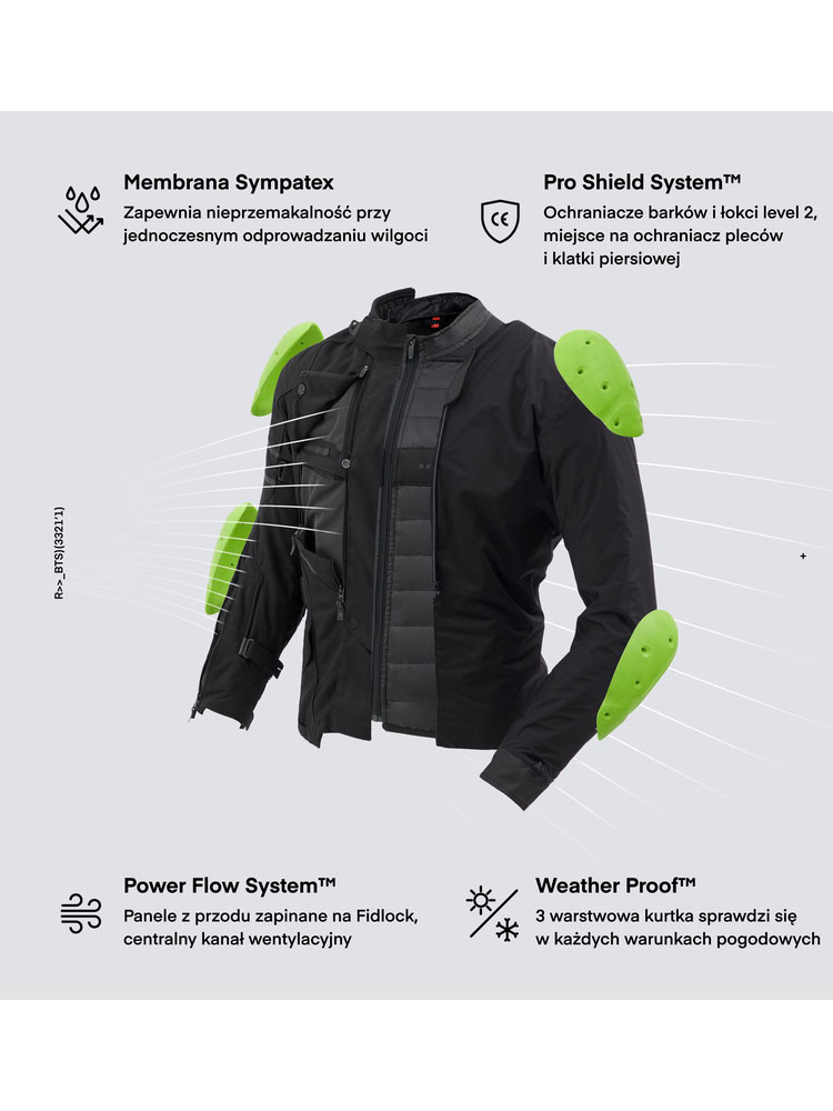 Kurtka motocyklowa tekstylna Range od marki Rebelhorn, to model dedykowany dla osób, które na pierwszym miejscu stawiają wysoki poziom bezpieczeństwa i komfort użytkowania. Kurtka może być użytkowana praktycznie przez cały rok. Wypinana membrana Sympatex o właściwościach wodoodpornych i wiatroszczelnych, w połączeniu z wypinaną podpinką ocieplającą sprawia, że użytkownik będzie przygotowany na nagłą zmianę warunków pogodowych. W cieplejsze dni o komfort termiczny zadbają rozmieszczone strategicznie otwory wentylacyjne. W aspekcie bezpieczeństwa należy wspomnieć o zastosowanych ochraniaczach, które umieszczono na barkach, łokciach i plecach. Co więcej konstrukcja została przystosowana do montażu opcjonalnego protektora klatki piersiowej. Dopełnieniem oferowanego poziomu ochrony są elementy odblaskowe Reflective, zwiększające widoczność motocyklisty w nocnych warunkach. Kurtka motocyklowa Rebelhorn Range posiada elastyczne wstawki, zapewniające maksymalną swobodę ruchów podczas jazdy. Trzy kieszenie typu Cargo będą idealnym miejscem do przechowywania podręcznych przedmiotów, natomiast na rękawie znajdziemy specjalną kieszeń na kartę płatniczą, dzięki czemu płacenie za autostradę lub paliwo będzie niezwykle proste i przyjemne.