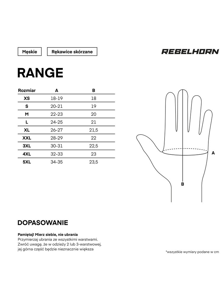 Range to rękawice motocyklowe skórzano-tekstylne od marki Rebelhorn. Zostały opracowane z myślą o osobach, które uwielbiają turystyczne podróże motocyklowe. Rękawice wykonano z wysokojakościowej skóry koziej oraz miękkiego i wygodnego materiału Tactel. Takie połączenie materiałów sprawia, że konstrukcja charakteryzuje się wytrzymałością i komfortem użytkowania. W miejscach szczególnie narażonych na przetarcia i przebicia zastosowano wzmocnienia z bardzo wytrzymałej tkaniny Superfabric oraz wstawki odpowiadające za absorpcję energii uderzenia, gdy dojdzie do upadku z motocykla. Dopełnieniem wysokiego poziomu ochrony jest umieszczony na kostkach certyfikowany, miękki protektor kostek SAS-TEC. Rękawice motocyklowe Rebelhorn Range oferują wydajną cyrkulację powietrza, dzięki punktowej perforacji, którą znajdziemy na dłoni oraz wewnętrznej stronie palców. Swobodną obsługę ekranów, umożliwia technologia TouchScreen. Ważnym elementem konstrukcji, który może się przydać w długich podróżach motocyklowych jest wbudowana w kciuka wycieraczka. Praktyczny pasek ułatwiający zakładanie rękawicy, w kooperacji z zapięciem na nadgarstku zapewnia precyzyjne dopasowanie pod preferencje i oczekiwania użytkownika.