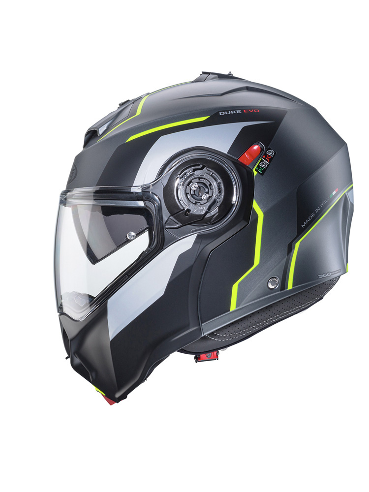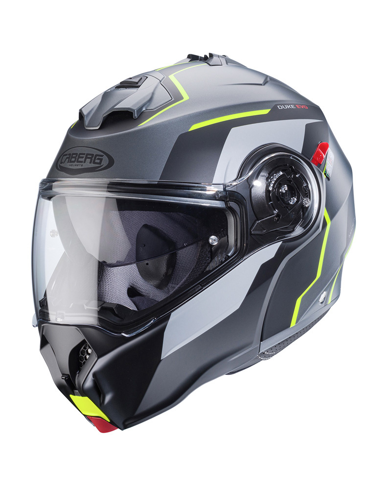 Caberg Duke Evo to wysokojakościowy kask motocyklowy szczękowy, którego skorupa została wykonana z wytrzymałego i doskonale absorbującego siłę uderzenia kompozytu ABS. Dodatkowo skorupa kasku jest produkowana w dwóch rozmiarach, co zapewnia optymalne dopasowanie. Model ten posiada homologację ECE 22-06, co oznacza, że kask opracowano zgodnie z normami bezpieczeństwa, obowiązującymi w krajach Unii Europejskiej. Kask szczękowy Duke Evo wyposażono w odporny na zarysowania wizjer, a także blendę przeciwsłoneczną. System Quick Release pozwala na błyskawiczną wymianę wizjera bez konieczności używania dodatkowych narzędzi zewnętrznych. Cyrkulację powietrza na wysokim poziomie gwarantują rozmieszczone strategicznie kanały wlotowe i wylotowe. Umieszczona wewnątrz wyściółka została wykonana z hipoalergicznego materiału i odpowiada za optymalne odprowadzanie wilgoci. Warto dodać, że wspomniana wyściółka jest w pełni wyjmowana, dzięki czemu nadaje się do prania. Oprócz tego w tym mode Kask szczękowy Duke Evo można zaopatrzyć w interkom motocyklowy (sprzedawany osobno). Zapięcie typu MicroLock stanowi bezpieczny system zamykania.