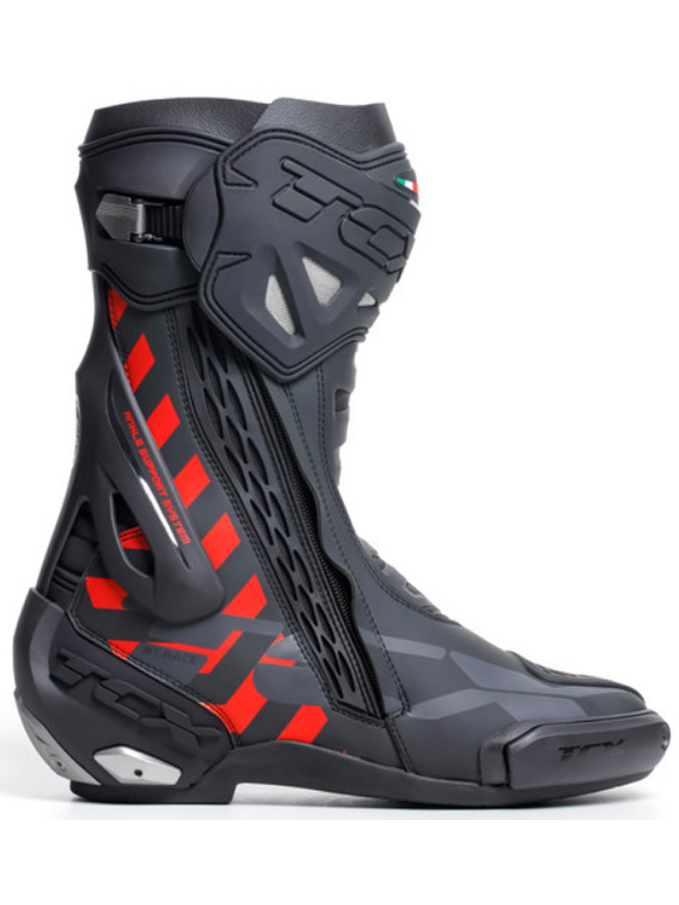TCX RT-Race to lekkie i eleganckie buty motocyklowe zaprojektowane z myślą o zapewnieniu wyjątkowego bezpieczeństwa oraz kontroli nad motocyklem. Utrzymane są w stylowym i agresywnym sportowym designie. Cholewka buta wykonana jest z odpornej na przetarcia mikrofibry, a wewnętrzna podszewka z siateczkowej tkaniny Air-Tech, która umożliwia swobodny przepływ powietrza. Ma to spory wpływ na szybkie i sprawne odprowadzanie wilgoci. Wkładka Ortholite® absorbuje drgania powstałe podczas jazdy. Model ten zawiera technologię Fasten Fit Control, wewnętrzny system sznurowania połączony z wyściółką buta, dzięki czemu cholewka świetnie dopasowuje się do kształtu łydki motocyklisty. RT-Race zapinane są również na zamek błyskawiczny przytwierdzony do elastycznego panelu. Za bezpieczeństwo odpowiada system Double Flex Control, który chroni staw skokowy poprzez ograniczenie jego ruchu w momencie nadwyrężenia. Dodatkowo obszar pięt, kostek i łydki wzmocniony jest ochraniaczami absorbującymi energię podczas ewentualnego kontaktu z nawierzchnią. Slider w przedniej części cholewki wykonany został z poliuretanu. W razie zużycia możliwa jest jego wymiana.