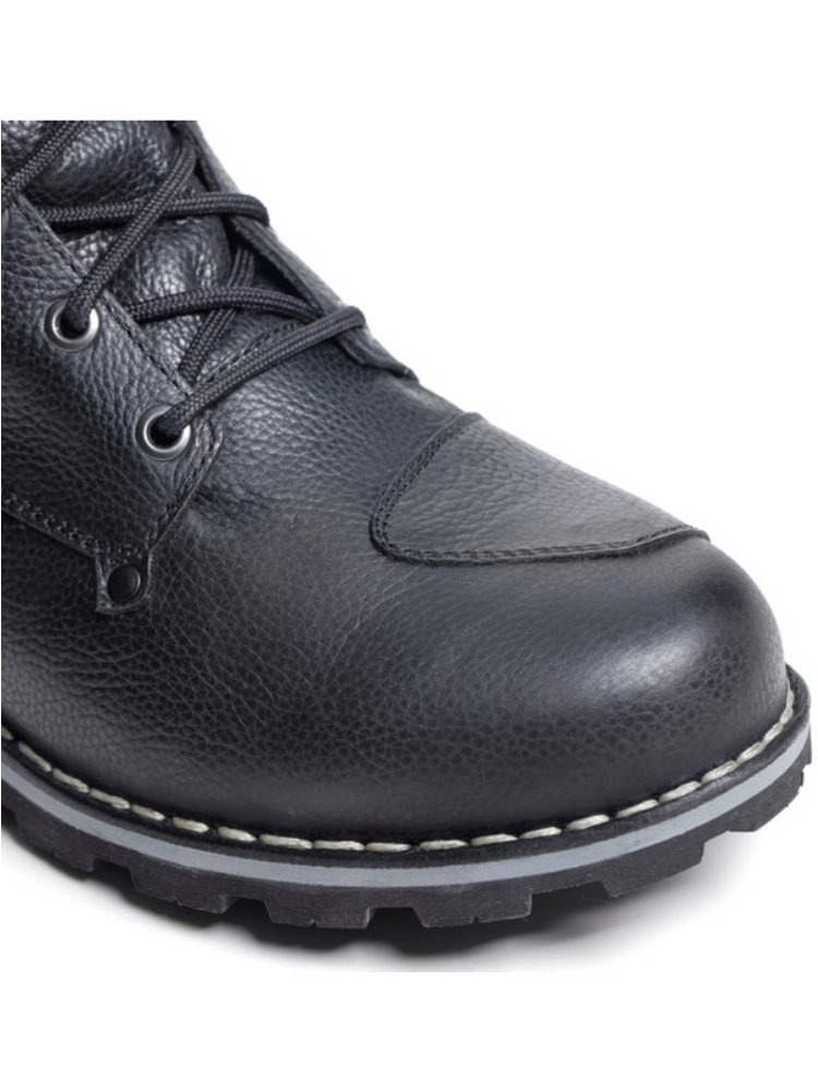 TCX Hero 2 WP to idealne rozwiązanie dla miłośników stylu vintage, którzy szukają nie tylko estetycznych, ale również funkcjonalnych butów motocyklowych. Cholewka wykonana z odpornej na przetarcia skóry licowej zapewnia nie tylko wytrzymałość, ale również świetny wygląd. Zapięcie na sznurowadła oraz zamek boczny oferuje lepsze dopasowanie do stopy, oraz ułatwia zakładanie i zdejmowanie obuwia. Skórzana wstawka umieszczona na przodzie cholewki ułatwia operowanie dźwignią zmiany biegów oraz zapobiega zużywaniu się materiałów. Wzmocnienia w obszarze pięt, kostek i palców gwarantują bezpieczeństwo podczas jazdy na motocyklu, a zszywana gumowa podeszwa ze zróżnicowanym bieżnikiem świetnie stabilizuje stopę podczas jazdy. Dodatkowym atutem Hero 2 WP jest wodoodporna i oddychająca membrana T-Dry, która chroni przed deszczem, jednocześnie umożliwiając odprowadzanie wilgoci na zewnątrz, dzięki czemu wnętrze pozostaje suche. Amortyzująca wkładka Ortholite o wysokim poziomie oddychalności, zapewnia komfortowe warunki użytkowania, a także zwiększa komfort noszenia.