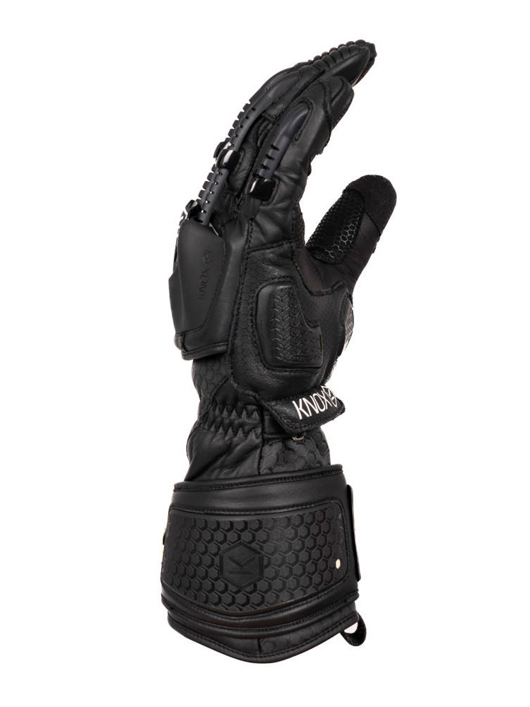 Skórzane rękawice motocyklowe Knox Handroid All MK5 to sportowy model, który swoim innowacyjnym wyglądem przyciąga wzrok. Skórzana konstrukcja zapewnia bezpieczne i wygodne użytkowanie rękawic. Producent zastosował dwa rodzaje skór: bydlęcą oraz kangurzą. Mocna i wytrzymała, a zarazem wygodna skóra bydlęca pokrywa górną stronę rękawicy, natomiast delikatną i miękką, ale równie wytrzymałą skórę kangura zastosowano na dłoni. Sprawia ona, że masz świetne wyczucie osprzętu motocykla, a dzięki antypoślizgowej wstawce dłoń nie przesuwa się po manetkach. Rękawice wyposażone są w twardy ochraniacz kostek, innowacyjny egzoszkielet, który pokrywa wszystkie palce oraz slidery dłoni z ochraniaczami Micro-Lock. Ponadto obszary najbardziej narażone na uszkodzenia jak brzeg i dłoń wzmocnione są dodatkową warstwą skóry oraz podwójnymi szwami. Jednowarstwowy makiet wykonany z mocnego i rozciągliwego materiału LDPE wyposażony jest w opatentowany system zapięcia Boa, który umożliwia precyzyjne dopasowanie przy użyciu jednego pokrętła. W nadgarstku umieszczony jest pasek do regulacji jego obwodu. Rękawice mają otwory wentylacyjne umieszczone od spodu palców, dzięki którym chłodne powietrze dostaje się do wnętrza. Miłym dodatkiem są panele umożliwiające obsługę urządzeń z ekranem dotykowym w rękawicach.