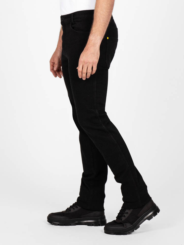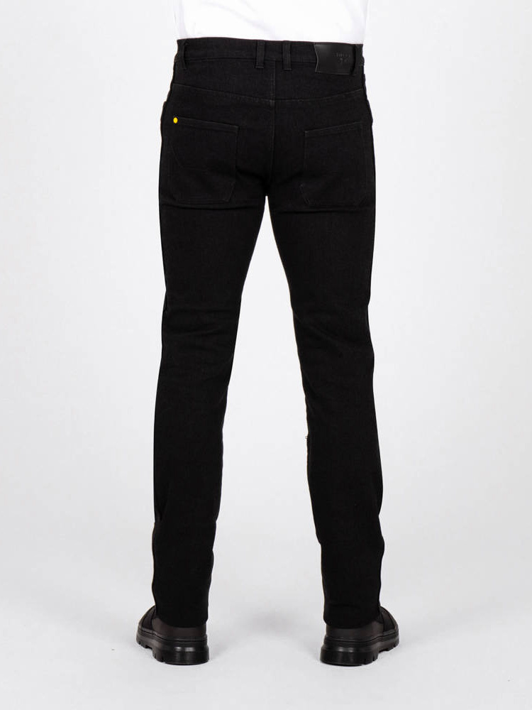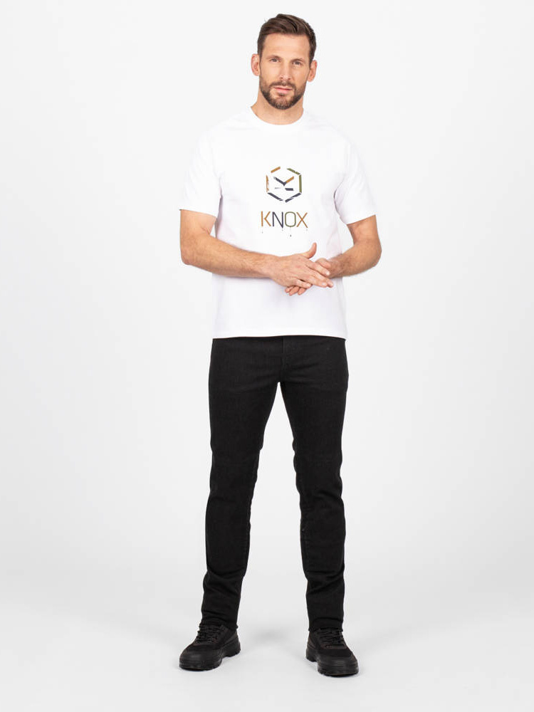 Posiadają certyfikat bezpieczeństwa EN17092 klasy A, który świadczy o bardzo dobrej odporności na przetarcie zastosowanego materiału. Jeansy w standardzie wyposażone są w certyfikowane ochraniacze Micro-Lock poziom 1, które osłaniają kolana oraz biodra. Ochraniacze te są wygodne w noszeniu, a w momencie uderzenia stają się solidną zbroją ochronną. Po wewnętrznej stronie kolan znajdują się dyskretne zamki, które pozwalają na wyjęcie ochraniaczy z zewnątrz. Jeansy posiadają solidne zamki YKK, pięć klasycznych kieszeni, szlufki na opcjonalny pasek oraz sześciokątny brelok na klucze. Uroku dodają detale w postaci skórzanej naszywki w pasie oraz nitów z logo Knox.