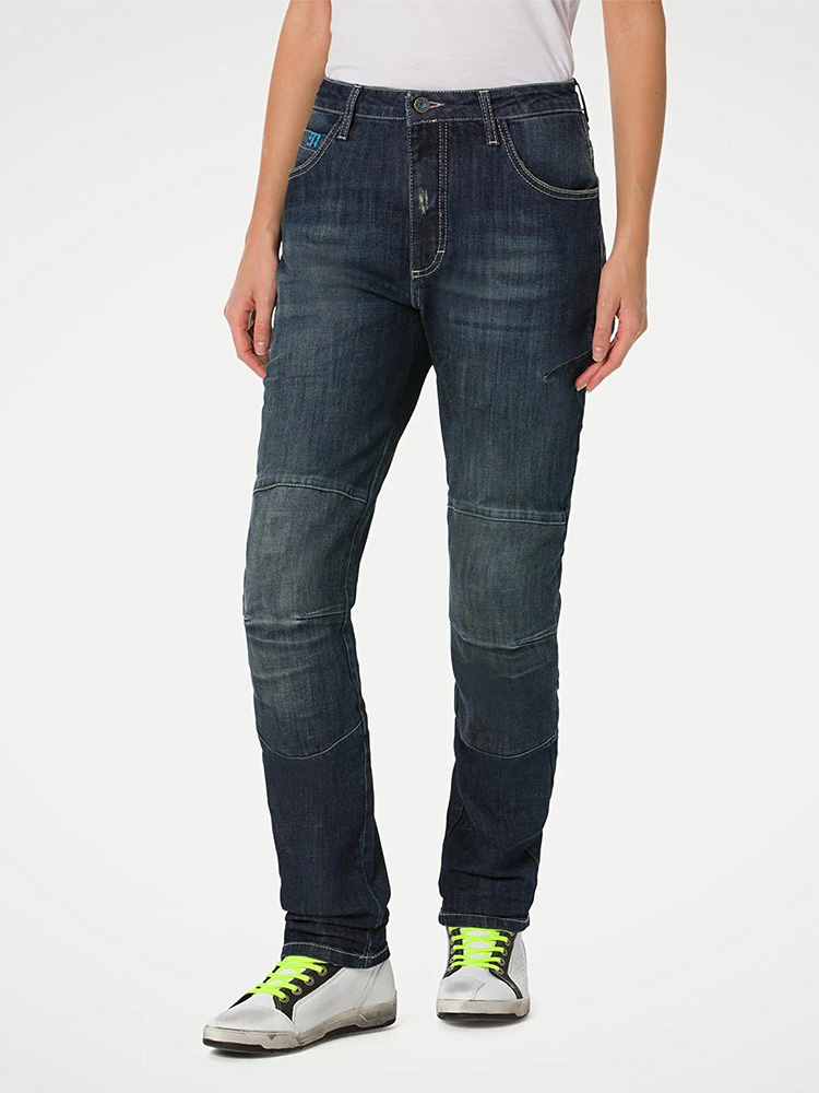 Wygodne jeansy motocyklowe damskie PMJ Jenny sprawdzą się podczas jazdy po mieście oraz na długie lub krótkie wycieczki. Ich klasyczny wygląd sprawi, że będą uniwersalnym elementem garderoby na wyjście do pracy, na motocykl i na spotkanie. Wysoki stan gwarantuje ochronę odcinka lędźwiowego i nerek przed owianiem lub chłodem, a także zapobiega wysuwaniu się warstwy bazowej ze środka. Spodnie mają homologację klasy AAA, która potwierdza ich najwyższy poziom bezpieczeństwa jako elementu motocyklowej garderoby, co zwiększa nasz komfort. Jeansy motocyklowe damskie PMJ Jenny zostały wyposażone w wyjmowane ochraniacze kolan level 1, które możemy regulować i dostosowywać do naszych preferencji. Protektory bioder są wyjmowane, co więcej możemy je wymienić na ochraniacze Zero-Shock Memory Foam, które dokupimy oddzielnie. Ochraniacze pochłaniają znaczną część energii wytworzonej podczas upadku. W ten sposób zabezpieczamy kolana i biodra przed urazem lub kontuzją. Jeansy zostały wykonane z elastycznego dżinsu, który nie gniecie i z łatwością dopasowuje się do budowy ciała. Tkanina Twaron wzmocniona od wewnątrz zapobiega rozdarciom i przetarciom.