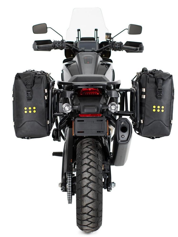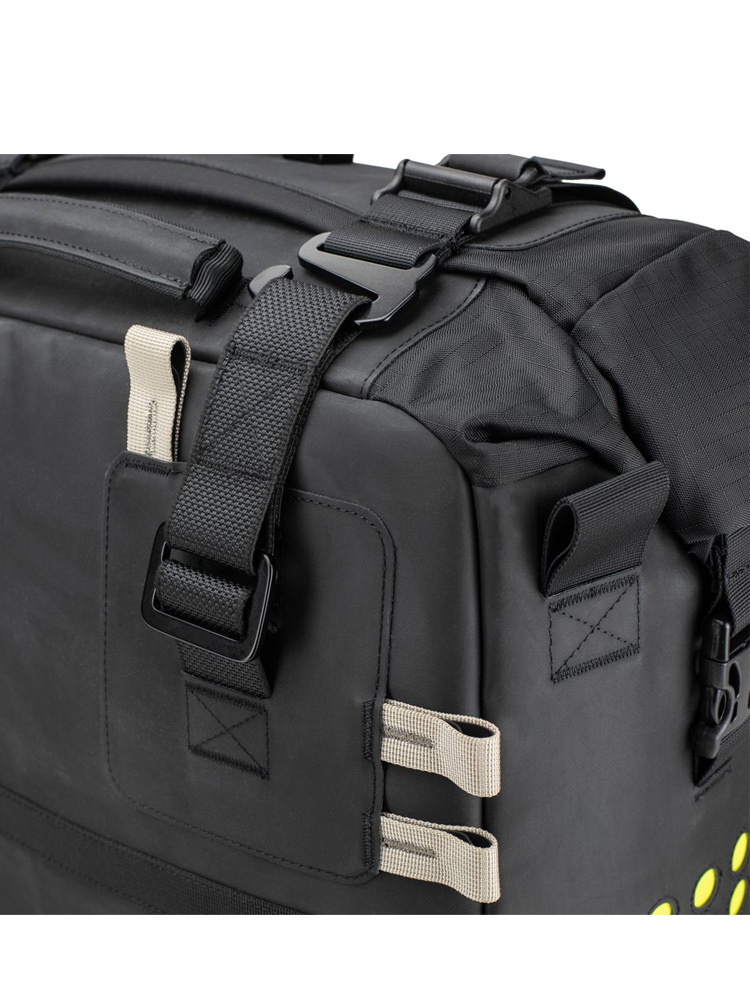 Paski mocujące zawarte w zestawie do pojedynczej lub podwójnej torby, a także regulowany pasek na ramię do przenoszenia torby po zejściu z motocykla.