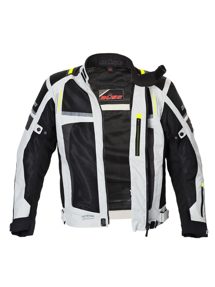 Kurtka motocyklowa tekstylna Livorno marki Büse. Wykonana z elastycznego poliestrowego materiału, która zapewnia doskonałą swobodę ruchu podczas jazdy. Aby zwiększyć odporność na przecięcia i otarcia, szczególnie w obszarach narażonych na uszkodzenia, takich jak łokcie i ramiona, zastosowano materiał Hitena® Dobby Nylon. Bezpieczne szwy spełniające normy ISO 4916, łączą poszczególne elementy, a odblaskowe detale na zewnętrznej warstwie kurtki, zwiększają bezpieczeństwo kierowcy w warunkach ograniczonej widoczności. Ponadto, obecność wentylowanych otworów na klatce piersiowej, plecach i rękawach zapewnia optymalną cyrkulację powietrza, pomagając utrzymać komfort termiczny podczas długich tras. Dostosowanie kurtki do indywidualnych potrzeb użytkownika jest proste dzięki umieszczonym regulacjom na ramionach i biodrach. Funkcjonalny zamek błyskawiczny na linii bioder umożliwia łączenie kurtki z odpowiadającymi spodniami motocyklowymi, tworząc kompletny zestaw. Kurtka na motocykl oferuje również praktyczne rozwiązania przechowywania, poprzez dwie kieszenie zewnętrzne i dwie kieszenie wewnętrzne. Do zwiększenia bezpieczeństwa zastosowano ochraniacze YF® na ramionach i łokciach. Ponadto, istnieje możliwość umieszczenia opcjonalnego protektora pleców SAS-TEC. Wszystkie ochraniacze są z możliwością wyjęcia.