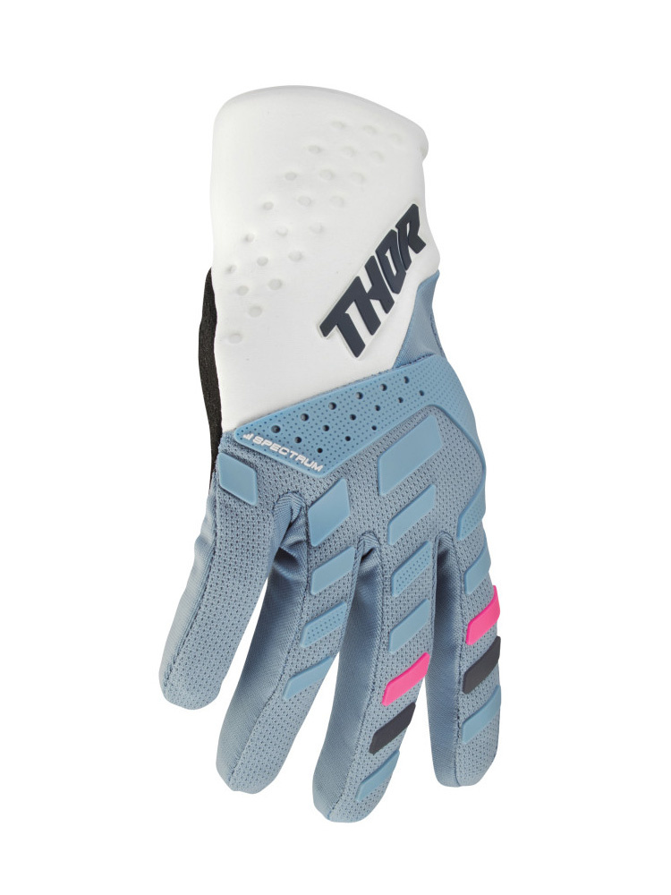 Thor Spectrum to rękawice cross, dedykowane do jazdy motocyklem w letniej porze roku. Zostały wykonane z mieszanki materiałów, w postaci przewiewnej, a zarazem oddychającej siateczki mesh oraz innowacyjnego materiału Airprene. Takie połączenie sprawia, że rękawice cross Spectrum zapewniają komfort termiczny w cieplejsze dni. W tym miejscu warto również o perforowanym palcach od spodu, które usprawniają cały proces cyrkulacji powietrza. Dłoń rękawicy jest wyściełana, co przekłada się na lepsze czucie manetek naszego motocykla. Na kostkach i palcach zastosowano gumowe ochraniacze ze sztucznego tworzywa TPR, zabezpieczające rękę użytkownika przy bezpośrednim kontakcie z asfaltem podczas ewentualnego upadku. W celu zwiększenia wytrzymałości całej konstrukcji, rękawice Spectrum wzbogacono o dodatkowe wzmocnienia, które znajdziemy na kciuku oraz w punktach chwytu. Za sprawą technologii TouchScreen możemy korzystać z urządzeń wyposażonych w ekran dotykowy bez konieczności zdejmowania rękawicy. Na nadgarstku umieszczono wygodne w użyciu zapięcie na rzep, gwarantujące optymalne dopasowanie rękawicy do preferencji użytkownika. Rękawice cross Thor Spectrum dostępne są w kilku wariantach kolorystycznych.