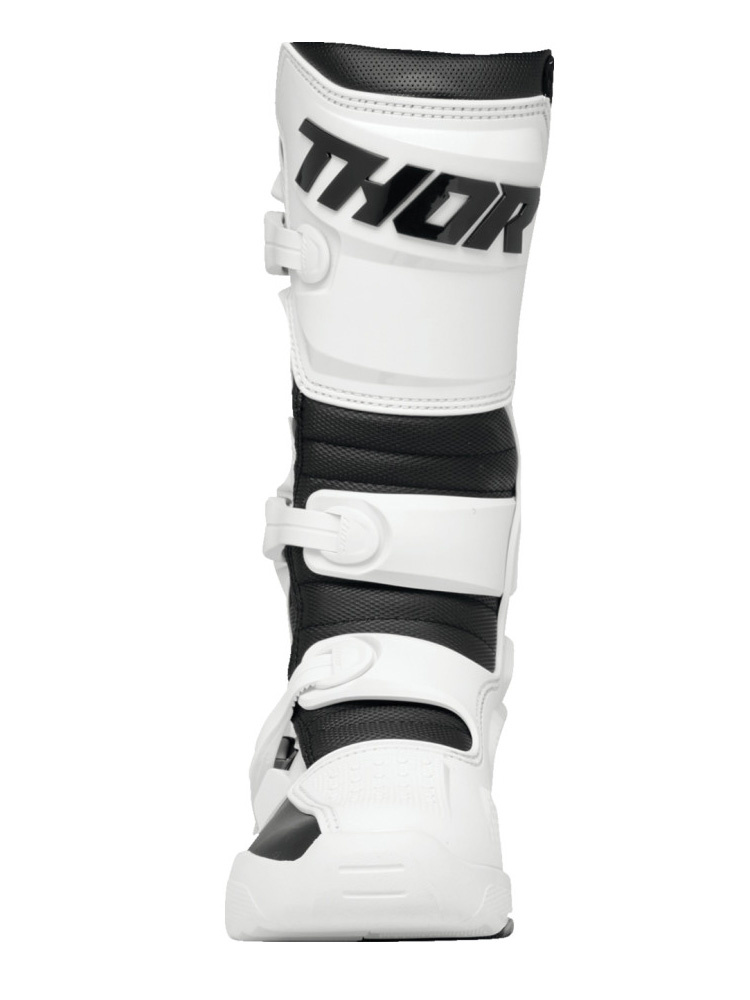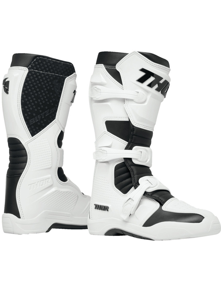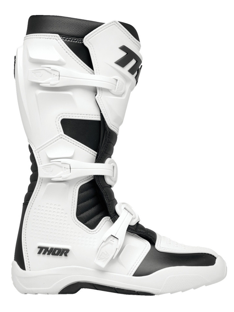 Blitz XR to świetnie prezentujące się buty enduro marki Thor stworzone na potrzeby fanów jazdy w terenie. Wygodne, wytrzymałe i bezpieczne. Idealne do jazdy po torze, jak i leśnymi szlakami. Buty enduro wykonane są z wysokiej jakości materiałów, które cechuje zwiększona wytrzymałość i odporność na zużycie. Posiadają dodatkowe wzmocnienia po wewnętrznej stronie łydki oraz w miejscu styku buta z dźwignią zmiany biegów. W celu zwiększenia ochrony buty wyposażone są w formowany wtryskowo ochraniacz goleni. Blitz XR mają wysoką cholewkę, która wykończona jest miękkim materiałem. Buty zapinane są na trzy solidne klamry z blokadą, które stabilnie trzymają nogę. Wyściółka butów wykonana jest z oddychającego meshu, który wyróżnia się doskonałymi właściwościami odprowadzania wilgoci. Dzięki temu wnętrze butów zachowuje przyjemnie suchy klimat. Nie mniej istotnym elementem butów jest formowana wtryskowo podeszwa zewnętrzna ze stalową wkładką, która zapewnia trwałość i doskonałą przyczepność do podłoża. W ofercie marki Thor znajdziesz bogatą kolorystykę butów enduro Blitz XR w szerokiej gamie rozmiarów.