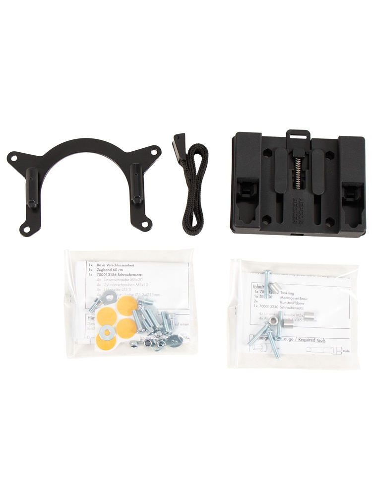 Ogólne funkcje i działanie pozostają takie same. To, co odróżnia mocowanie Basic od mocowania Lock-it, to zmiana z magnetycznego systemu blokowania na system w pełni mechaniczny. Rzeczywisty „metalowy pierścień” specyficzny dla modelu jest taki sam dla obu wersji. Uwaga: Torba na zbiornik z uchwytem Lock-it nie może być umieszczona na pierścieniu zbiornika BASIC i odwrotnie. Uchwyt na zbiornik i pierścień na zbiornik muszą pochodzić z tego samego systemu.