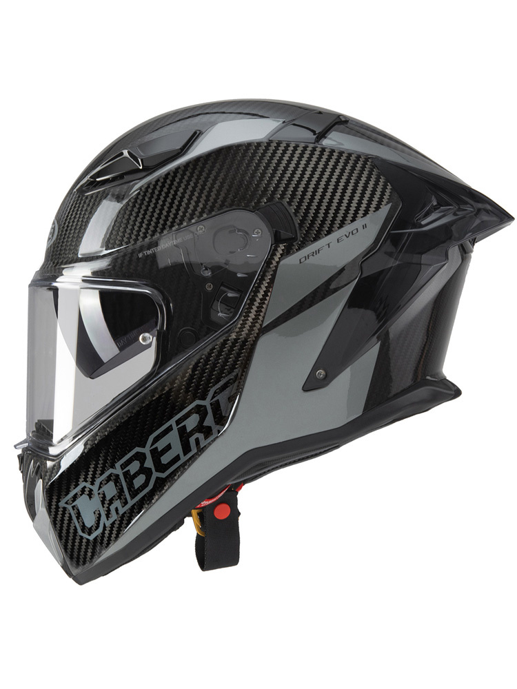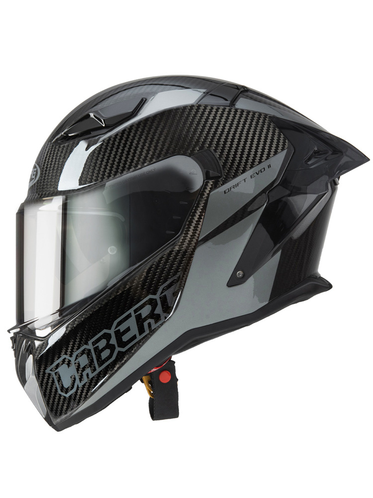 Drift Evo II to kask motocyklowy integralny od marki Caberg. Wykonany został z Carbonu, dzięki czemu konstrukcja charakteryzuje się niską wagą, a także niezwykłą wytrzymałością, która objawia się m.in. w doskonałej absorpcji energii uderzenia. Skorupa jest produkowana w dwóch rozmiarach, dzięki czemu kask integralny Caberg Drift Evo II oferuje precyzyjne dopasowanie. Rozmieszczone strategicznie wloty i wyloty powietrza stanowią wydajny system wentylacji, który zapewnia komfort termiczny nawet podczas intensywnej jazdy motocyklem. W zestawie z kaskiem otrzymujemy Pinlock Max Vision zapobiegający parowaniu szybki. Zastosowany system Quick Release, umożliwia łatwy demontaż wizjera bez konieczności jakichkolwiek narzędzi. Największą zmianą względem poprzedniej generacji jest SOS Medical ID. Jest to system, umożliwiający szybkie przekazanie informacji medycznych w sytuacji ewentualnego upadku z motocykla. Umieszczony na kasku kod QR, może zostać zeskanowany przez ratowników, którzy natychmiast otrzymają wszystkie informacje medyczne o poszkodowanym motocykliście. Kask integralny Drift Evo II może być użytkowany, w połączeniu z interkomem motocyklowym Caberg Pro Speak Evo (sprzedawany oddzielnie). Homologacja ECE 22.06 informuje nas, że kask został opracowany według europejskich standardów bezpieczeństwa.