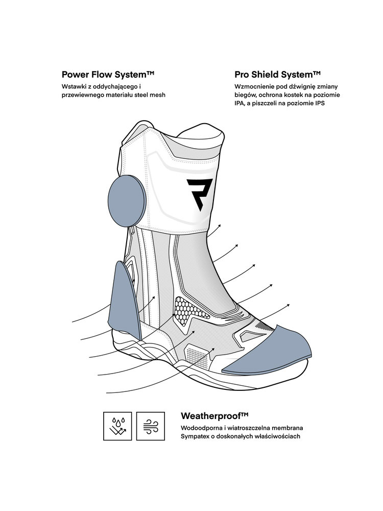 Rebelhorn Range to buty motocyklowe, przeznaczone do turystycznej jazdy. Zapewniają stały dopływ świeżego powietrza, dzięki zastosowaniu podszewki 3D Mesh, wstawek z oddychającego i przewiewnego materiału steel mesh oraz cholewce obuwia opracowanej na bazie mikrofibry. Ostatni z wymienionych materiałów, dodatkowo charakteryzuje się wytrzymałością, dzięki czemu buty motocyklowe turystyczne Rebelhorn Range wyróżniają się solidnym wykonaniem. Swoją wytrzymałość, zawdzięczają również wtryskiwanemu materiałowi KPU, który zdecydowano się umieścić w miejscach szczególnie narażonych na uszkodzenia. Na kostkach i piszczelach znajdziemy protektory, oferujące różny stopień ochrony. Piankowa wkładka pokryta poliestrowym meshem, absorbuje drgania, zwiększając tym samym komfort noszenia. Do walorów tego modelu, na pewno należy zaliczyć wodoodporną membranę Sympatex. Jej obecność sprawia, że stopa motocyklisty jest odpowiednio zabezpieczona przed wodą, a same buty motocyklowe turystyczne Range znajdą zastosowanie nawet przy intensywnych opadach deszczu. Buty motocyklowe turystyczne Range zaopatrzono w dwa długie zamki oraz rzep regulacyjny. W ten sposób użytkownik, może dopasować obuwie pod indywidualne preferencje.