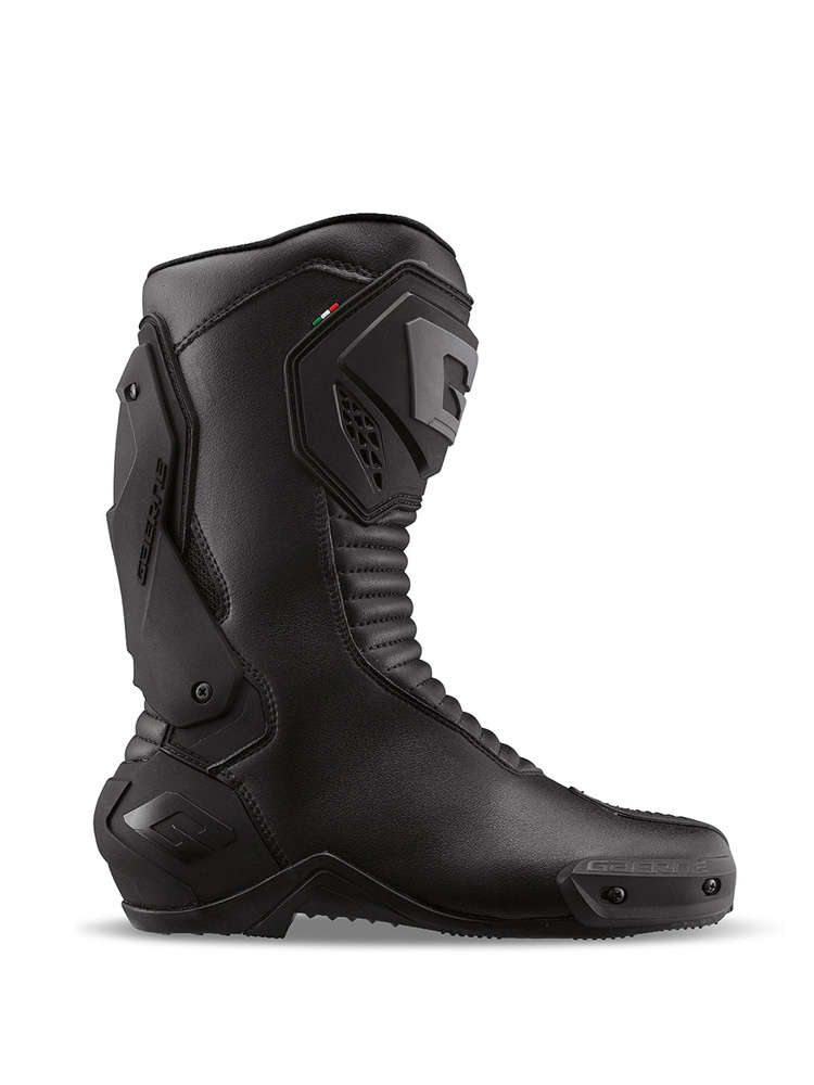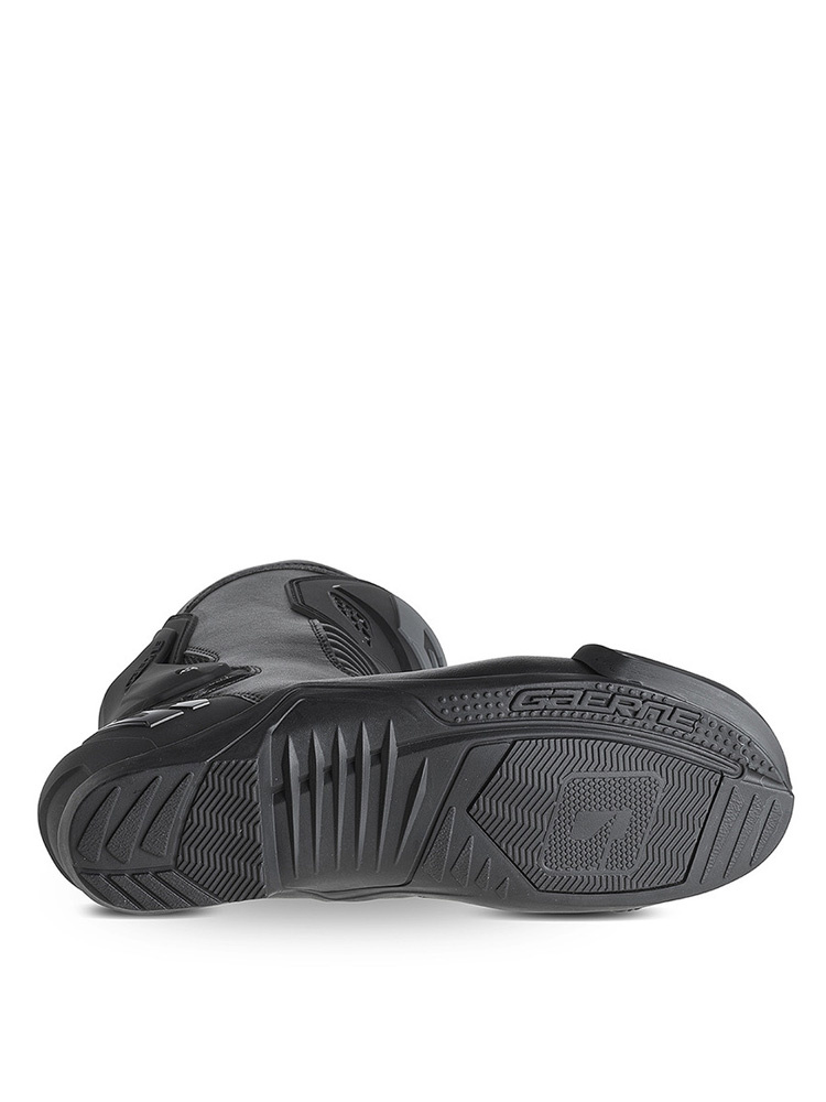 Buty motocyklowe G.RS od marki Gaerne to stylowy i wygodny model zaprojektowany z myślą o bezpiecznej jeździe zarówno po torze, jak i po ulicach. Wyprodukowane we Włoszech z wysokiej jakości mikrofibry, która cechuje się bardzo dobrą odpornością na ścieranie. Rozciągliwe panele na przodzie i w tyle pozwalają na wygodniejszy manewr stopą. Zaletą butów motocyklowych G.RS jest opatentowany system Gaerne Floating Pivot System (GFPS), który pozwala na naturalny ruch kostki przy jednoczesnej ochronie przed skręceniem, przeprostem oraz zgięciem. Anatomicznie ukształtowana osłona na goleniu wykonana jest ze wtryskiwanego poliuretanu, zapewniając należyte wsparcie. Z tego samego materiału, wykonana jest wstawka zastosowana w miejscu styku buta z dźwignią zmiany biegów. Na palcach znajdują się wymienne slidery. Oddychająca wyściółka wewnątrz butów odpowiada za utrzymanie przyjemnie suchego klimatu wokół stopy. Dodatkowo w obszarze kostki ma różną grubość, dzięki czemu zapewnia maksymalny komfort. Model G.RS wyposażony jest w boczne zapięcie na zamek i duży rzep. Zwiększoną przyczepność i odporność na zużycie oferuje antypoślizgowa, zewnętrzna podeszwa o różnorodnym bieżniku.