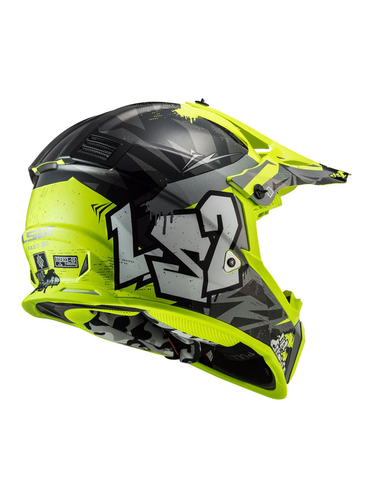 LS2 Fast Evo II Mini to opracowany z myślą o najmłodszych uzytkownikach kask na crossa. Skorupa kasku wyróznia się lekkością i wysokim poziomem wytrzymałości, dzięki zastosowaniu kompozytu KPA, składającego się z połączenia poliwęglanu oraz tworzyw termoplastycznych. Wnętrze zostało wypełnione hipoalergiczną wyściółką, która zapewnia skuteczne usuwanie potu i wilgoci z twarzy motocyklisty. Pianka EPS o wielu gęstościach, w znacznym stopniu zwiększa komfort użytkowania. Kask enduro LS2 Fast Evo II Mini zaopatrzono w Emergency Quick Release System (EQRS), umożliwiający awaryjne zdjęcie kasku w sytuacjach krytycznych. Jest to niezwykle przydatne rozwiązanie, zwłaszcza przy ewentualnym upadku z motocykla, gdy potrzebne jest udzielenie pomocy medycznej, poszkodowanemu użytkownikowi. Do atutów LS2 Fast Evo II Mini z pewnością należy zaliczyć system wentylacji. Rozmieszczone strategicznie otwory wlotowe i wylotowe, gwarantują cyrkulację powietrza na wysokim poziomie. Kask motocrossowy Fast Evo II Mini znajdzie zastosowanie na zamkniętych obiektach wyścigowych, dzięki zastosowaniu zapięcia typu DD (Double-D). Konstrukcja spełnia europejskie wymogi w kwestii bezpieczeństwa, co potwierdza homologacja ECE 22.06.