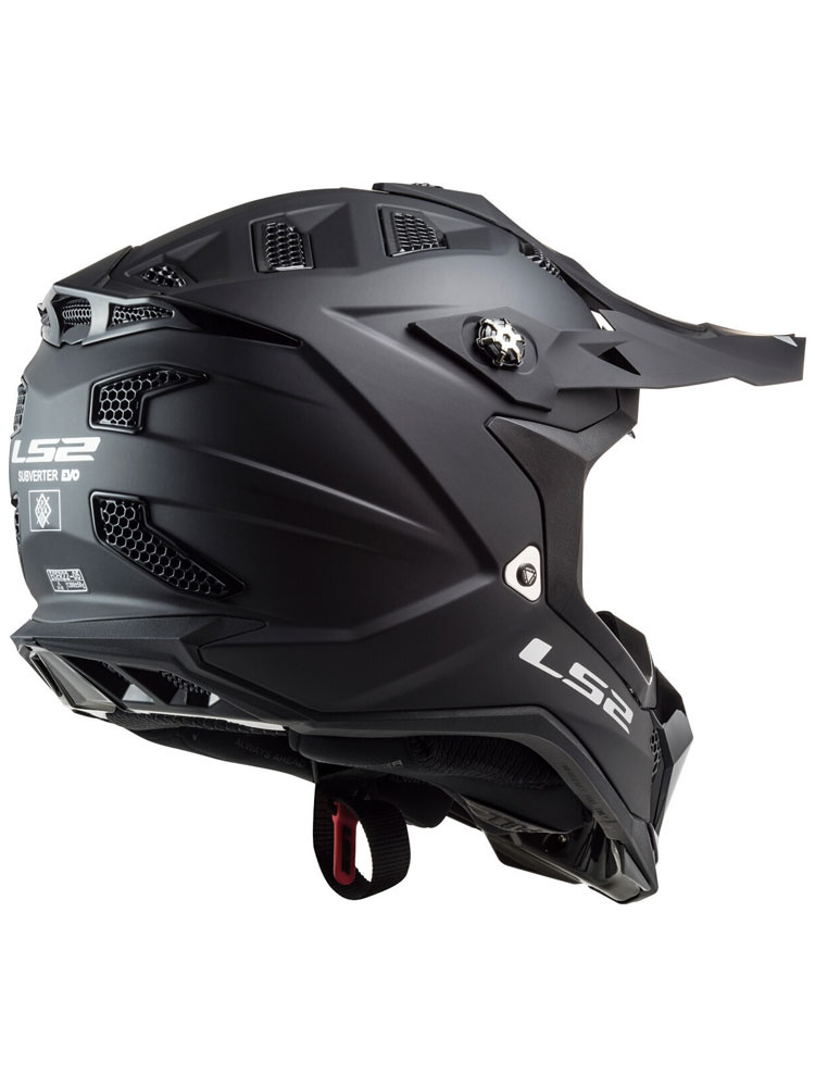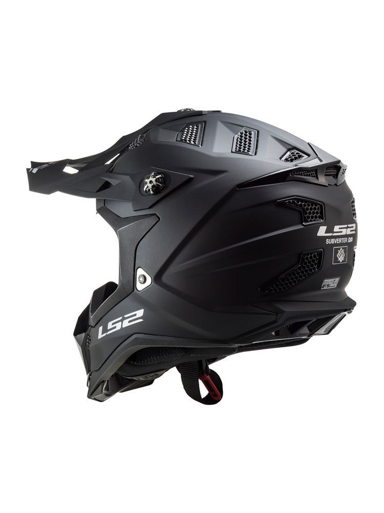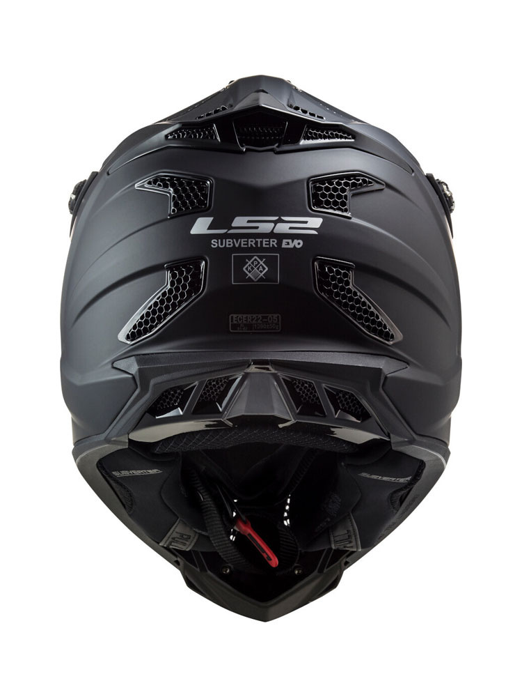 Subverter Evo II, to idealny kompan do terenowych wypraw motocyklowych. Zapewnia komfort termiczny, nawet podczas intensywnej jazdy motocyklem, dzięki zastosowanemu systemowi wentylacji, na który składają się liczne otwory wlotowe oraz umieszczone w tylnej części wyloty powietrza. Wnętrze kasku zostało wypełnione hipoalergiczną wyściółką, która jest w pełni wyjmowana i nadaje się do prania. Oprócz tego, w środkowej części umieszczono piankę EPS o wielu gęstościach, dla zwiększenia komfortu użytkowania. W tym modelu użyty został kompozyt KPA, z którego została wykonana skorupa kasku. Dzięki niemu, konstrukcja uzyskuje takie walory jak: lekkość i wytrzymałość. Za sprawą zapięcia Double-D (DD), kask motocrossowy LS2 Subverter Evo II, można w legalny sposób użytkować na światowych torach wyścigowych. Umieszczony w górnej części daszek jest regulowany, a w razie potrzeby można go w łatwy sposób zdemontować. W sferze bezpieczeństwa, należy zwrócić uwagę na system Emergency Quick Release. Jego obecność może się okazać niezwykle ważna, zwłaszcza przy ewentualnym upadku z motocykla. Za pomocą tego systemu, ratownicy medyczni mogą w bezpieczny sposób zdjąć kask z głowy motocyklisty i tym samym przystąpić do udzielenia pierwszej pomocy. Kask enduro LS2 Subverter Evo II posiada homologację ECE 22.06, co oznacza, że został opracowany według europejskich standardów bezpieczeństwa.