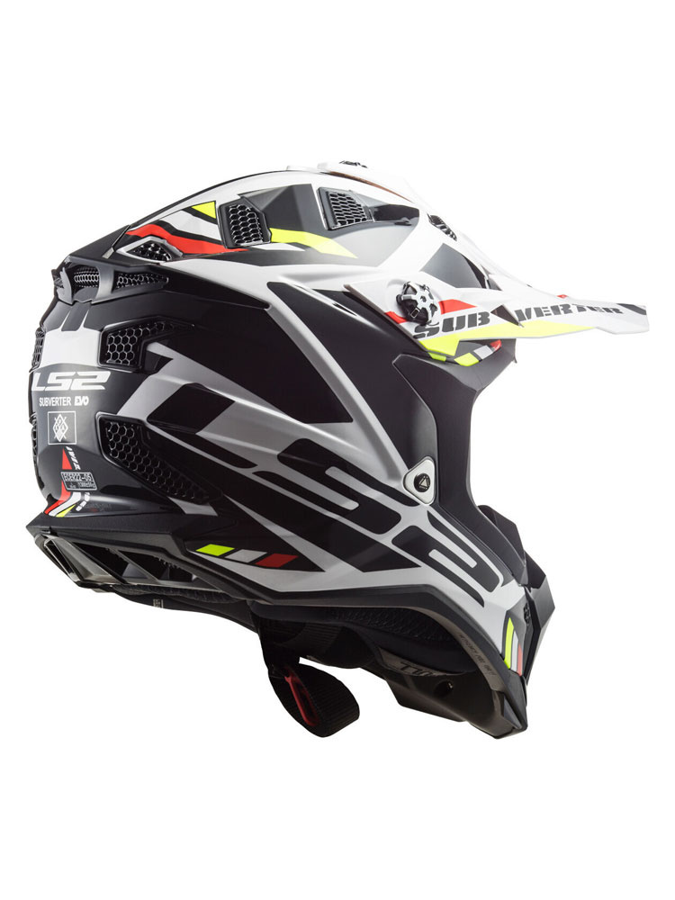 Subverter Evo II, to idealny kompan do terenowych wypraw motocyklowych. Zapewnia komfort termiczny, nawet podczas intensywnej jazdy motocyklem, dzięki zastosowanemu systemowi wentylacji, na który składają się liczne otwory wlotowe oraz umieszczone w tylnej części wyloty powietrza. Wnętrze kasku zostało wypełnione hipoalergiczną wyściółką, która jest w pełni wyjmowana i nadaje się do prania. Oprócz tego, w środkowej części umieszczono piankę EPS o wielu gęstościach, dla zwiększenia komfortu użytkowania. W tym modelu użyty został kompozyt KPA, z którego została wykonana skorupa kasku. Dzięki niemu, konstrukcja uzyskuje takie walory jak: lekkość i wytrzymałość. Za sprawą zapięcia Double-D (DD), kask motocrossowy LS2 Subverter Evo II, można w legalny sposób użytkować na światowych torach wyścigowych. Umieszczony w górnej części daszek jest regulowany, a w razie potrzeby można go w łatwy sposób zdemontować. W sferze bezpieczeństwa, należy zwrócić uwagę na system Emergency Quick Release. Jego obecność może się okazać niezwykle ważna, zwłaszcza przy ewentualnym upadku z motocykla. Za pomocą tego systemu, ratownicy medyczni mogą w bezpieczny sposób zdjąć kask z głowy motocyklisty i tym samym przystąpić do udzielenia pierwszej pomocy. Kask enduro LS2 Subverter Evo II posiada homologację ECE 22.06, co oznacza, że został opracowany według europejskich standardów bezpieczeństwa.