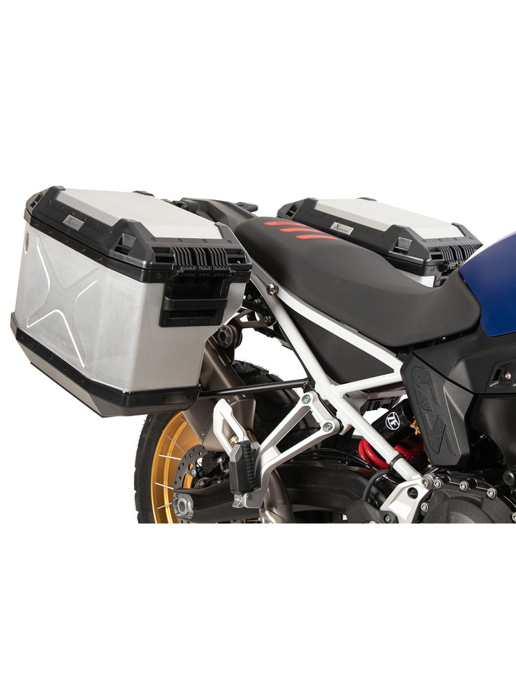 - zestaw kufrów bocznych Xplorer Cutout wraz ze stelażem bocznym (na prawą i lewą stronę) ze stali nierdzewnej,