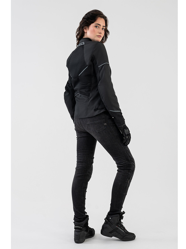 Damska kolekcja ubrań motocyklowych marki Shima zwiększyła się o niezwykle przewiewną kurtkę tekstylną X-Mesh 2.0. To model dedykowany do jazdy po mieście o letniej porze roku. Wykonana jest z wysokiej jakości poliestru 500D oraz dużych paneli mesh umieszczonych na klatce piersiowej, plecach i rękawach. Mocne, podwójne szwy wzmacniają konstrukcję. Na wyposażeniu damskiej kurtki motocyklowej tekstylnej X-Mesh 2.0 znajdują się certyfikowane ochraniacze AirForce™ poziom 2 na plecach oraz poziom 1 na łokciach i ramionach. To nowy rodzaj protektorów, który wyróżnia się elastycznością i przewiewnością. Kieszenie na ochraniacze łokci mają regulację wysokości położenia. Całość uzupełniają wstawki odblaskowe, dzięki którym jesteś widoczna w słabym świetle i po zmroku. Model ma dopasowany do kobiecej sylwetki krój z wyprofilowanymi rękawami, co ułatwia przyjęcie pozycji na motocyklu. Rzepy regulacyjne w pasie i na mankietach, krótki zamek i pętelka do spięcia ze spodniami oraz dwie praktyczne kieszenie to elementy, które podnoszą komfort użytkowania kurtki.