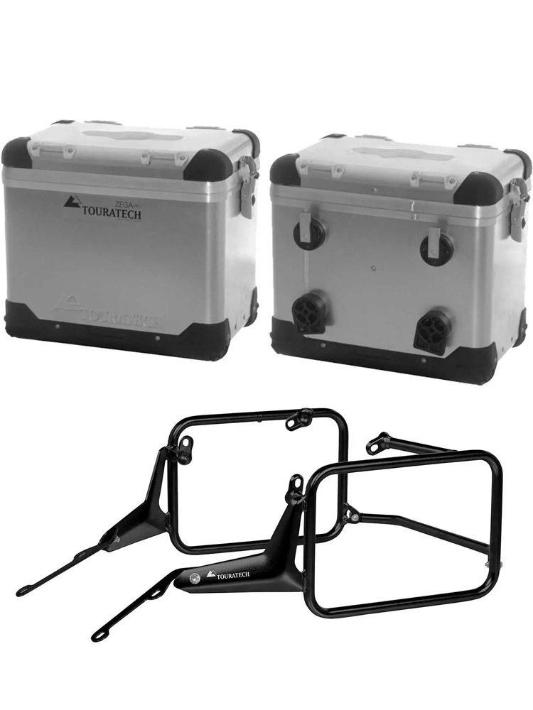 Zestaw: kufry boczne aluminiowe srebrne Zega Pro + stelaże czarne Touratech BMW R1300GS (23-) [poj.: 45+45l]