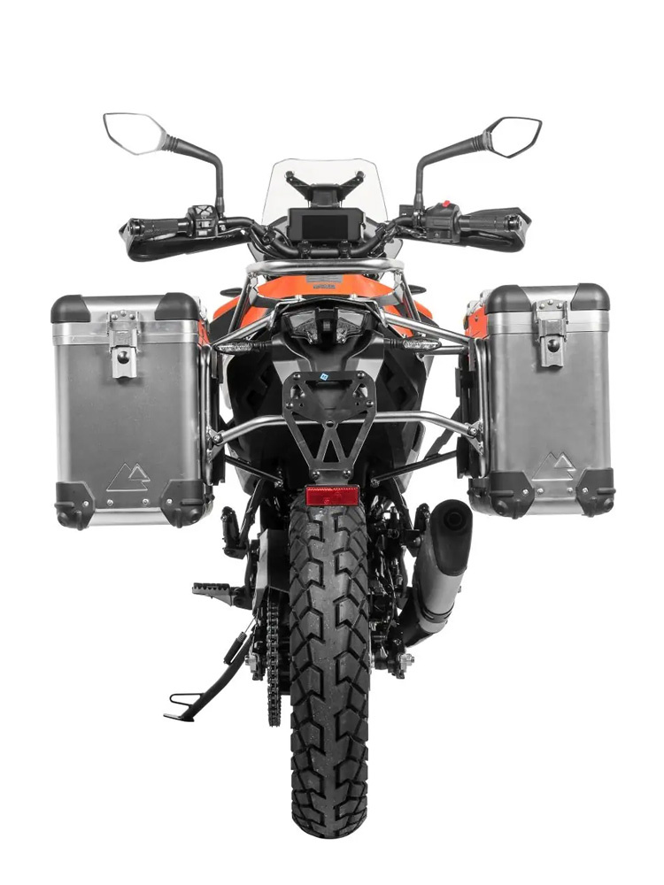 Zestaw: kufry boczne aluminiowe srebrne Zega Pro + stelaże srebrne Touratech KTM 390 Adventure [poj.: 31+38l]