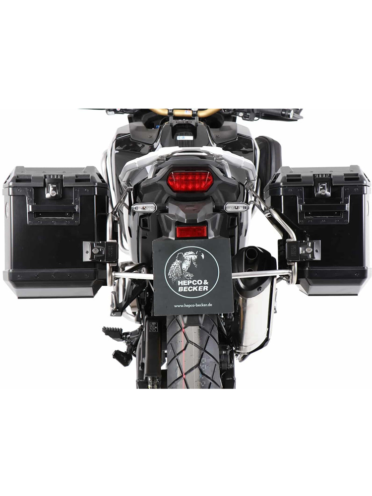 - zestaw kufrów bocznych Xplorer Cutout wraz ze stelażem bocznym (na prawą i lewą stronę) ze stali nierdzewnej,