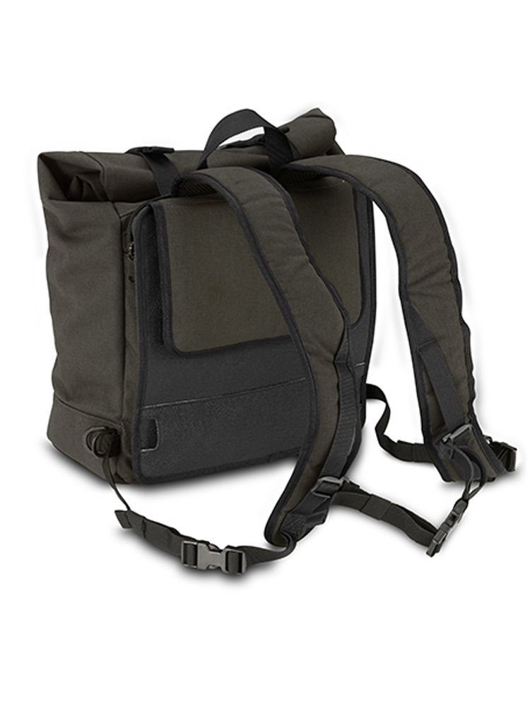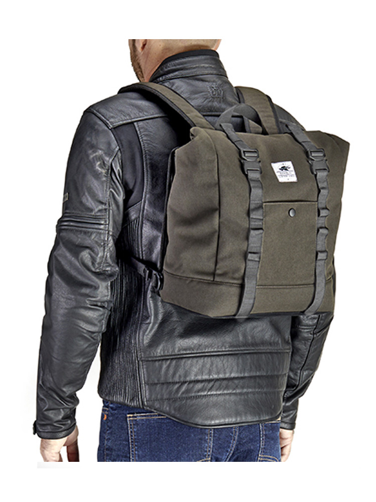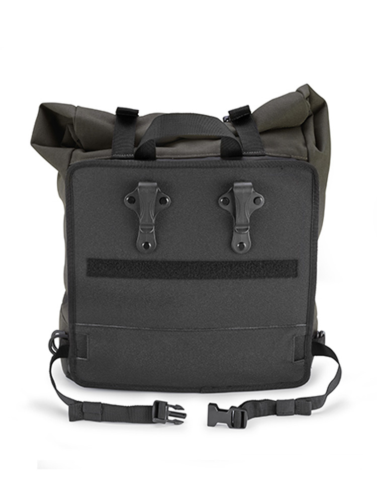 Dzięki regulowanym szelkom, torbę można nosić jak plecak. Tylny, antypoślizgowy panel zapewnia stabilność podczas jazdy, a przedni uchwyt ułatwia przenoszenie torby poza motocyklem.
