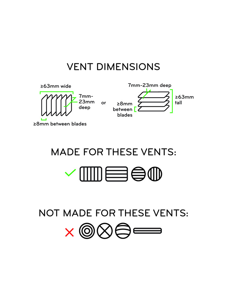 - Montaż na szerokiej gamie otworów wentylacyjnych pojazdu (patrz kompatybilność poniżej)