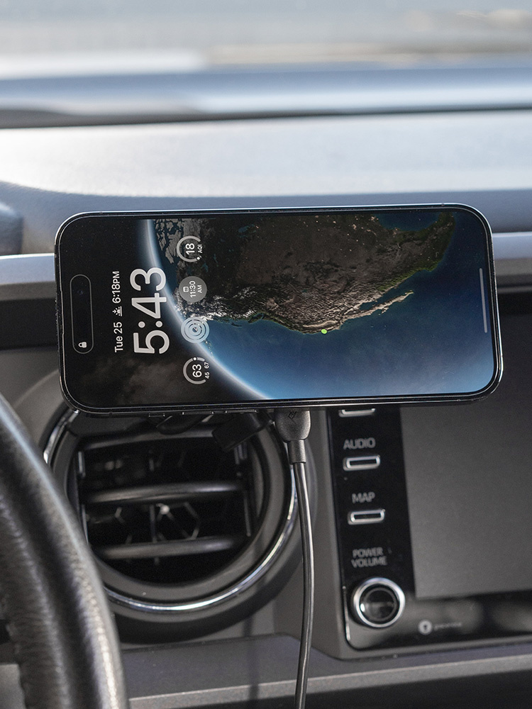 - W zestawie kabel USB-C o długości 1 m i niskoprofilowy adapter do gniazdka samochodowego 15 V i więcej (do Iphone 13 i nowszych) z certyfikatem Qi2