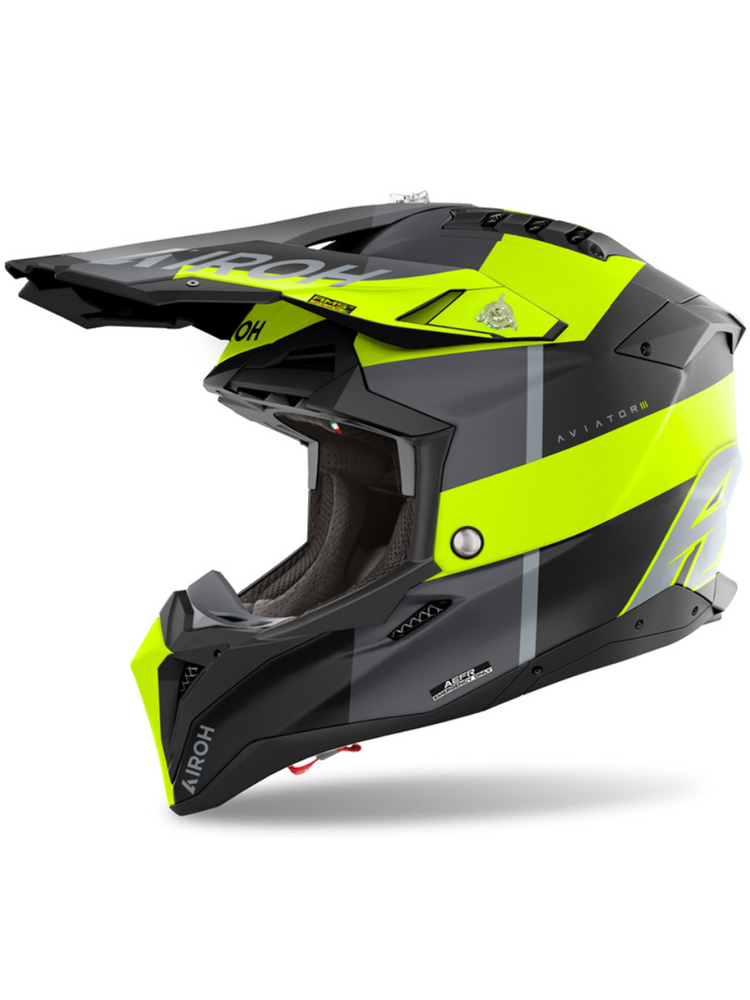 Airoh Aviator 3 to kask motocyklowy enduro, który stworzono do wypadów motocyklowych w teren. Kask wyróżnia się solidną konstrukcją, dzięki wykonanej z wytrzymałego kompozytu H.P.C skorupie. Omawiana skorupa jest produkowana w czterech rozmiarach i tym samym zapewnia idealne dopasowanie. Dużym walorem tego modelu jest niewątpliwie wydajna cyrkulacja powietrza, którą model Aviator 3 zawdzięcza rozmieszczonym na całej powierzchni kasku otworom wlotowym i kanałom wylotowym, wchodzącym w skład wydajnego systemu wentylacji. Wnętrze kasku standardowo zostało wypełnione wyściółką, która posiada elementy odblaskowe oraz poduszkami policzkowymi. Za pomocą systemu MAGNETIC oba elementy możemy w wygodny sposób i oddać do prania. System A.M.S.S Plus pozwala na awaryjne zdjęcie poduszek policzkowych, w celu ułatwienia dostępu ratownikom medycznym do poszkodowanego motocyklisty. W górnej części kasku znajdziemy regulowany daszek, który możemy dopasować wedle swoich własnych preferencji. Sama konstrukcja kasku enduro Aviator 3 umożliwia montaż opcjonalnej kamery GOPRO, dzięki czemu motocyklista będzie mógł uchwycić najciekawsze momenty wyprawy motocyklowej. W tym modelu mamy do czynienia z zapięciem DD.