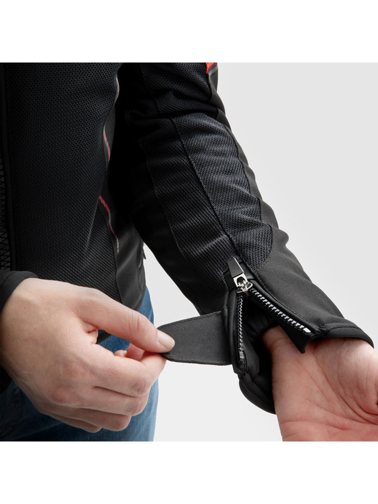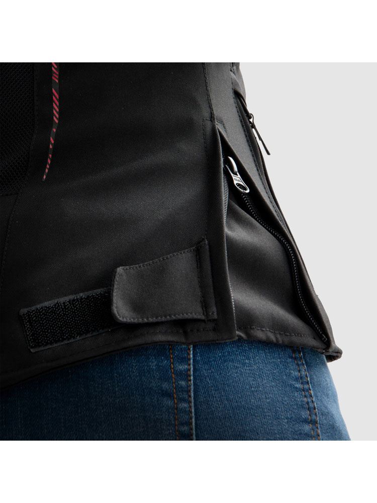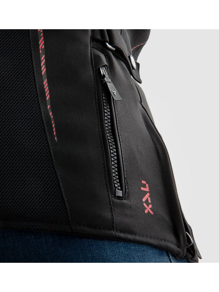 Kurtka motocyklowa tekstylna Jax posiada trzy kieszenie - dwie zewnętrzne oraz jedną wewnętrzną - w których bezpiecznie można przechowywać drobne przedmioty. Zamek 8VST doskonale posłuży jako element, umożliwiający komfortowe spięcie kurtki ze spodniami.