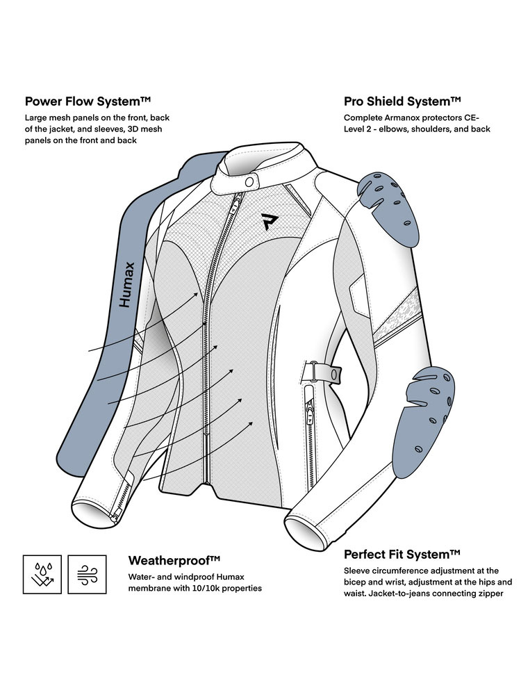 Kurtka motocyklowa tekstylna Rebelhorn Jax sprawia, że użytkowniczka jest odpowiednio przygotowana na nagłą zmianę warunków pogodowych, w postaci opadów deszczu oraz mocnych podmuchów wiatru. Kluczową rolę w tym aspekcie odgrywa obecność w tej kurtce wypinanej membrany Humax, która posiada właściwości wodoodporne i wiatroszczelne.