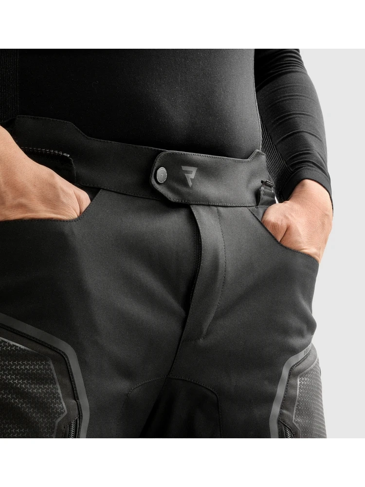 Spodnie motocyklowe tekstylne Rebelhorn Borg II to połączenie wygody, nowoczesnej technologii oraz wysokiego poziomu bezpieczeństwa. Wykonane z wysokogatunkowego poliestru i elastycznego materiału Hyperstretch®, perfekcyjnie dopasowują się do ciała, zapewniając pełną swobodę ruchów. Specjalne wzmocnienia Ripstop w miejscach szczególnie narażonych na zużycie zwiększają ich trwałość. Ochraniacze na kolanach i biodrach Armanox z certyfikacją CE-Poziom 2, a także możliwość zastosowania protektora kości ogonowej oraz slidery kolanowe sprawiają, że model ten oferuje wysoki poziom ochrony przy ewentualnym upadku. Spodnie motocyklowe Borg II można użytkować także podczas intensywnych opadów deszczu, dzięki zaopatrzeniu w wypinaną membranę HydraShield™ PRO. Funkcjonalne panele wentylacyjne na udach z systemem Fidlock® oraz kanały wentylacyjne z przewiewnym materiałem zwiększają przepływ powietrza w gorące dni. Dwie pojemne kieszenie umożliwiają wygodne przechowywanie drobiazgów, a regulacje w pasie i nogawkach pozwalają na idealne dopasowanie. Zamek 360° do spięcia z kurtką to dodatkowy element zwiększający praktyczność kompletu. Rebelhorn Borg II zostały opracowane według europejskich norm bezpieczeństwa. Fakt ten, potwierdza certyfikat CE.