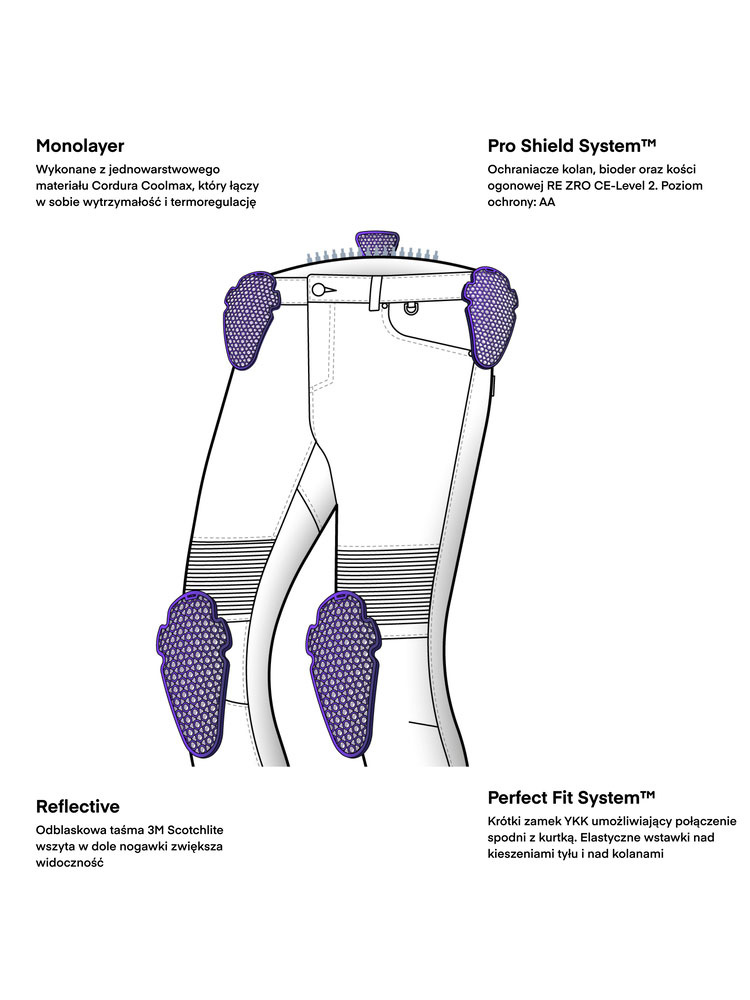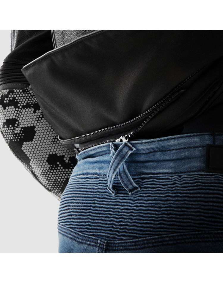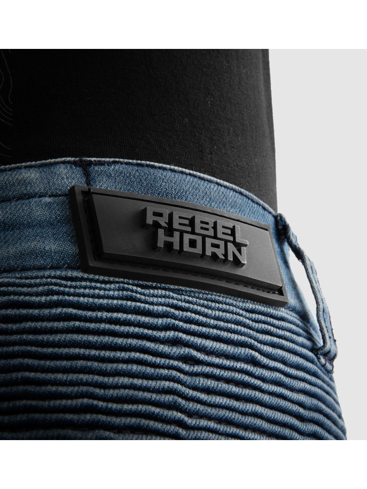 Rebelhorn Revolt to wybór dla motocyklistów, którzy poszukują wyjątkowego połączenia komfortu, bezpieczeństwa i stylu. Przy produkcie zastosowano mieszankę tkanin — Cordura gwarantuje wysoką odporność na przetarcia, Coolmax dba o komfort termiczny, a bawełniana podszewka zapewnia komfort noszenia. Jeansy motocyklowe zostały opracowane według europejskich standardów bezpieczeństwa, czego potwierdzeniem jest certyfikat CE. W tym modelu zastosowano certyfikowane ochraniacze RE ZRO®. Rozmieszczone na biodrach, kolanach i obrębie kości ogonowej, chronią te partie ciała przed uszkodzeniami i złamaniami, które mogą doprowadzić do powstania poważnych kontuzji. Warto dodać, że wszystkie protektory można w łatwy sposób wyjąć, tym samym przekształcając jeansy motocyklowe w odzież do codziennego użytkowania. Ochraniacze, w połączeniu ze zwiększającymi widoczność na drodze odblaskowymi elementami 3M™ Scotchlite, gwarantują bezpieczeństwo na wysokim poziomie. Ergonomiczne elastyczne wstawki, solidne okucia i trwałe szwy IronSeam™ zapewniają wytrzymałość oraz doskonałe dopasowanie. Niezbędne kieszenie i praktyczne zamki pozwalają cieszyć się pełną funkcjonalnością na co dzień, a estetyczne wykonanie podkreśla charakter dynamicznego stylu motocyklowego.