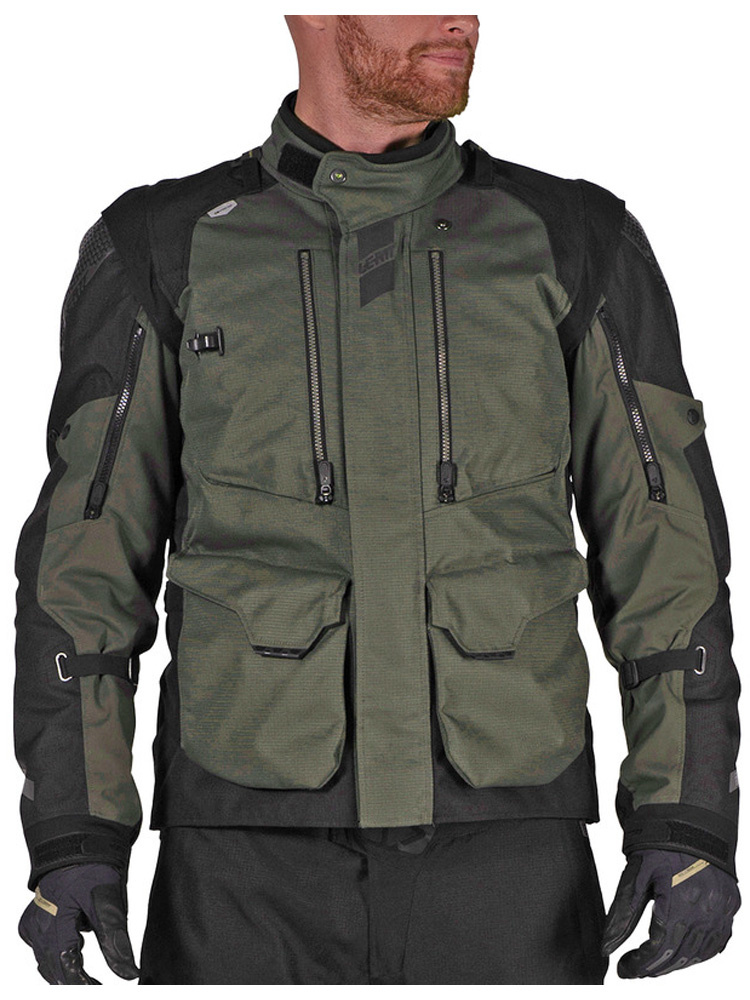 Kurtka motocyklowa Leatt ADV MultiTour 5.5 wykonana została z wytrzymałego materiału Leatt Ripstop, oferuje odporność na uszkodzenia mechaniczne, a strategicznie rozmieszczone wzmocnienia na ramionach i łokciach zwiększają poziom bezpieczeństwa. Przepływ powietrza w cieplejsze dni zapewniają obszerne panele wentylacyjne na klatce piersiowej i plecach oraz zamki wentylacyjne na ramionach. Regulacja w pasie i na przedramionach umożliwia indywidualne dopasowanie, a elastyczne panele na mankietach zwiększają swobodę ruchów. Kurtka wyposażona jest w wypinaną membranę HydraDri® EVO (20 000 mm/20 000 g/m²), która skutecznie chroni przed deszczem i wiatrem, zachowując jednocześnie oddychalność. Na chłodniejsze dni przewidziano wyjmowaną podpinkę ocieplającą. Komfort użytkowania podnosi także zapinana na zamek, wygodna podszewka. Model MultiTour 5.5 oferuje wiele funkcjonalnych kieszeni, w tym wodoodporne kieszenie z przodu, na plecach i wewnątrz kurtki, a także kieszenie do ogrzewania dłoni. Dodatkowo przewidziano kieszeń z siatki na podpinkę ocieplającą oraz specjalną przegrodę na system nawadniający HydraPak o pojemności 1,5 l. Pod względem ochrony kurtka spełnia najwyższe standardy bezpieczeństwa – wyposażona jest w protektor pleców (EN1621-2 poziom 2) oraz protektory ramion i łokci (EN1621-1 poziom 2). Posiada również kieszeń na ochraniacz klatki piersiowej (EN1621-3 poziom 2, dostępny osobno) i jest kompatybilna z ochraniaczem szyi dzięki systemowi BraceOn. Widoczność motocyklisty w trudnych warunkach poprawiają odblaskowe detale. Długi zamek błyskawiczny umożliwia szybkie połączenie ze spodniami, a regulowane zapięcia na rzep na mankietach, biodrach i kołnierzu pozwalają na idealne dopasowanie. Leatt ADV MultiTour 5.5 to kurtka stworzona na długie trasy, oferująca ochronę i komfort w każdych warunkach.