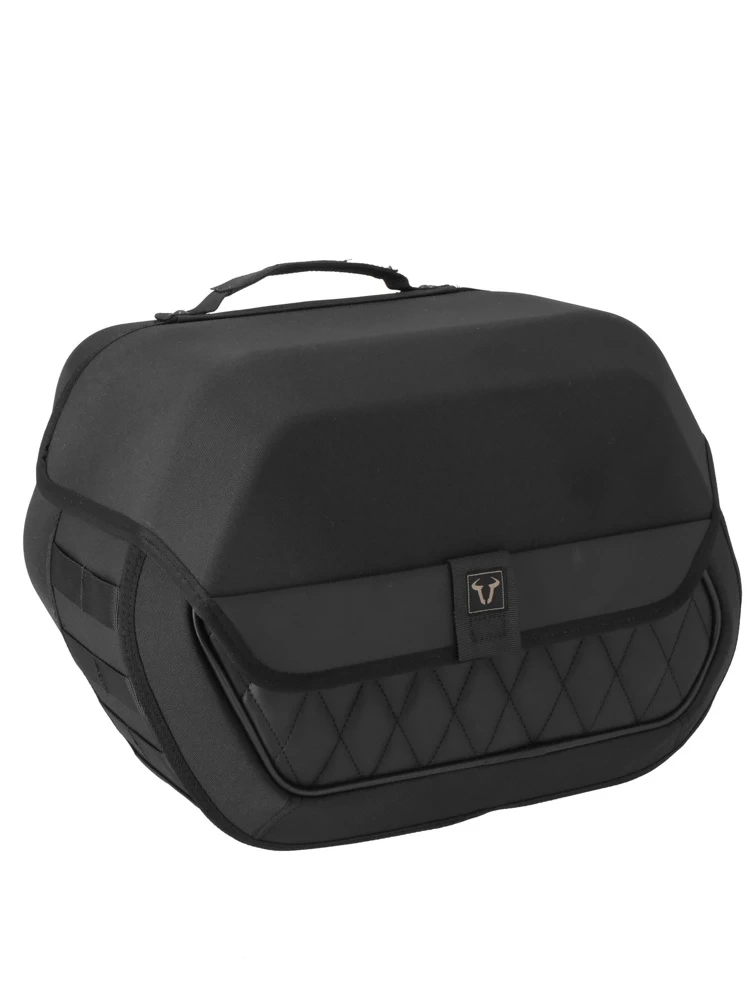 - Atrakcyjny wygląd: połączenie czarnego materiału tekstylnego z poliestru 600D i czarnej sztucznej skóry z misternymi przeszyciami w kształcie rombów, elementy wykonane z tworzywa ABS z laminatem tekstylnym