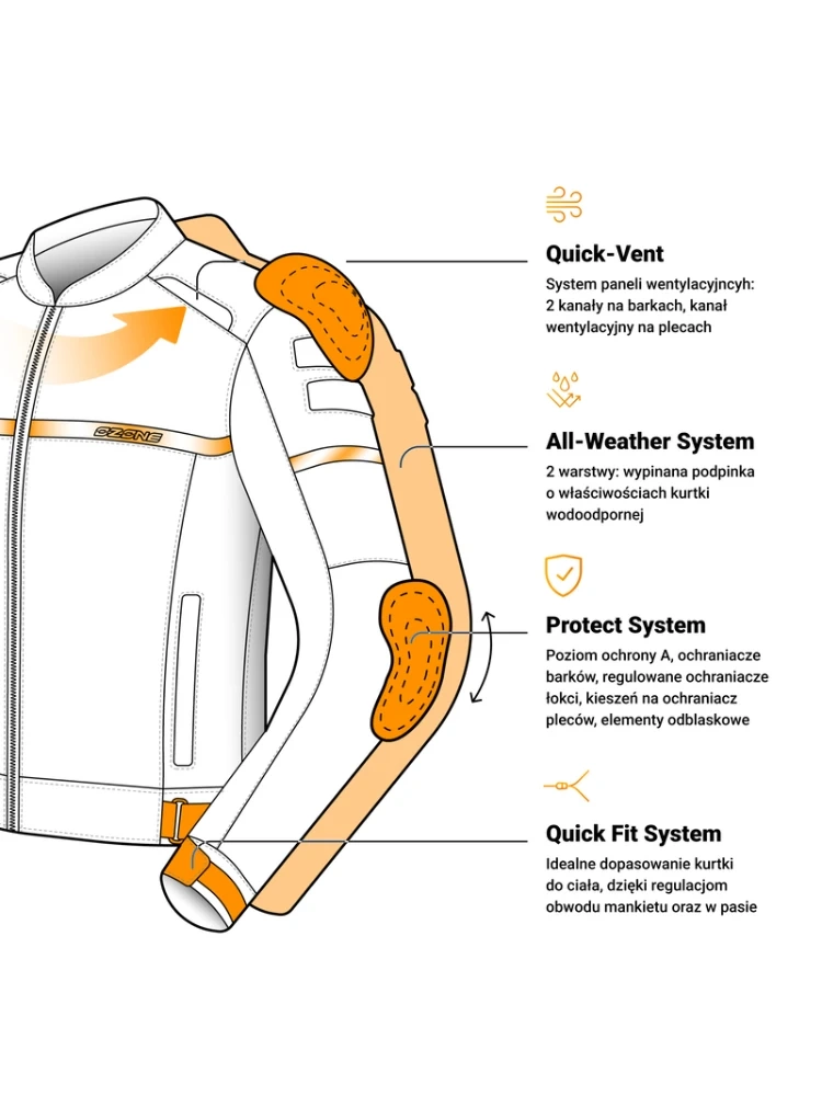 Wygodna kurtka motocyklowa tekstylna Ozone Rider to niezawodny towarzysz każdej podróży motocyklem, łączący komfort i styl. Dzięki zewnętrznej warstwie wykonanej w 100% z poliestru, kurtka zapewnia trwałość i odporność na codzienne wyzwania, a wypinana, ocieplana podpinka z właściwościami wodoodpornymi umożliwia komfortowe użytkowanie nawet w chłodne i deszczowe dni. Ochraniacze łokci i barków spełniają standard CE-Level 1, a dzięki specjalnej kieszeni na ochraniacz pleców SW-253 A możesz podnieść poziom bezpieczeństwa dokupując protektor. Widoczne odblaskowe elementy zwiększą widoczność na drodze podczas jazdy. Dwa kanały wentylacyjne na barkach i jeden na plecach zapewniają wydajną cyrkulację powietrza podczas jazdy w cieplejsze dni, a regulacje w mankietach i pasie ułatwiają dopasowanie. Dodatkowe kieszenie – dwie zewnętrzne zapinane na zamek i jedna wewnętrzna – gwarantują wygodne miejsce na najpotrzebniejsze drobiazgi. Kurtka motocyklowa tekstylna Ozone Rider została wyposażona w smukły krój slim fit, który dodaje kurtce wyrazistego, nowoczesnego stylu, który z łatwością dopasujesz do reszty motocyklowego outfitu.