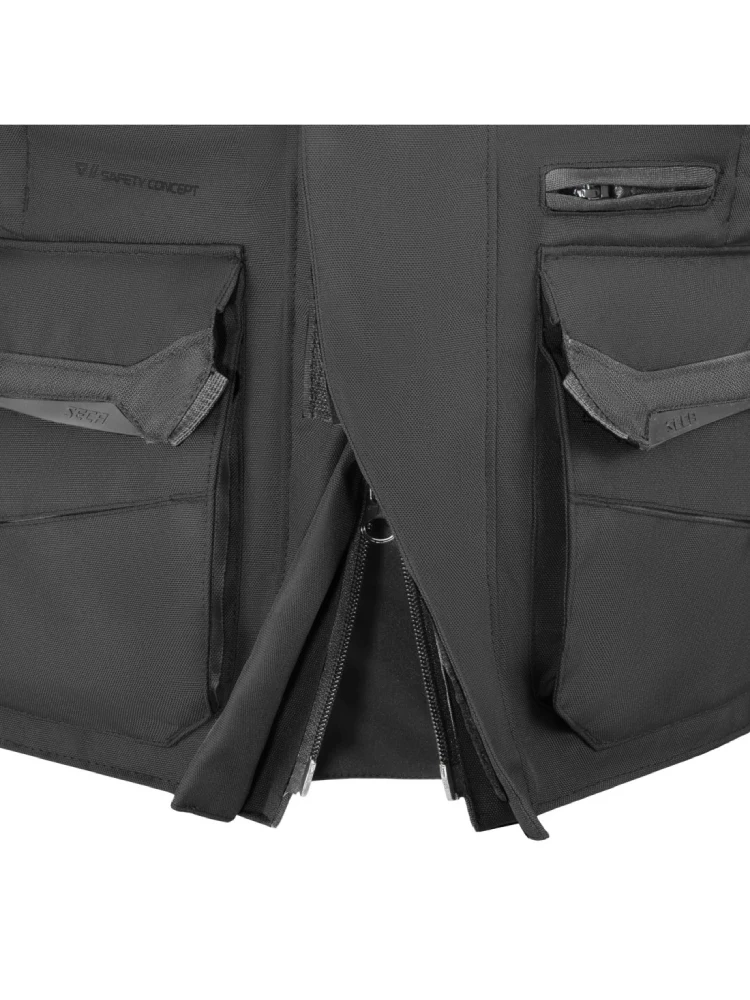 System łączenia S_CONNECT umożliwia wygodne przypięcie membrany do kurtki, co jest szczególnie przydatne przy nagłych zmianach pogody. Dodatkowo kurtka na motocykl jest wyposażona w funkcjonalny system mocowania Molle® oraz 14 kieszeni — pięć na przodzie w tym dwie wodoodporne typu cargo, dwie boczne zapinane na napę (za kieszeniami cargo), jedna zapinana na zamek na kluczyk (powyżej kieszeni cargo), dwie z tyłu: jedna centralna wodoodporna typu cargo, jedna boczna zapinana na zamek (za kieszenią cargo), jedna na lewym przedramieniu na kartę, zapinana na zamek oraz cztery wewnętrzne kieszenie w tym jedna wodoodporna, jedna zapinana na rzep, jedna wentylowana zapinana na zamek i jedna przeznaczona na telefon. System regulacji w okolicach talii, rękawów oraz mankietów pozwala na indywidualne dostosowanie kurtki do własnych potrzeb, a elastyczne panele harmonijkowe umieszczone na łokciach, plecach oraz w pasie zwiększają wygodę i swobodę ruchów. Zamek 360° oraz krótki zamek umożliwiają wygodne połączenie kurtki ze spodniami, zapewniając lepszą ochronę i wygodę podczas jazdy.