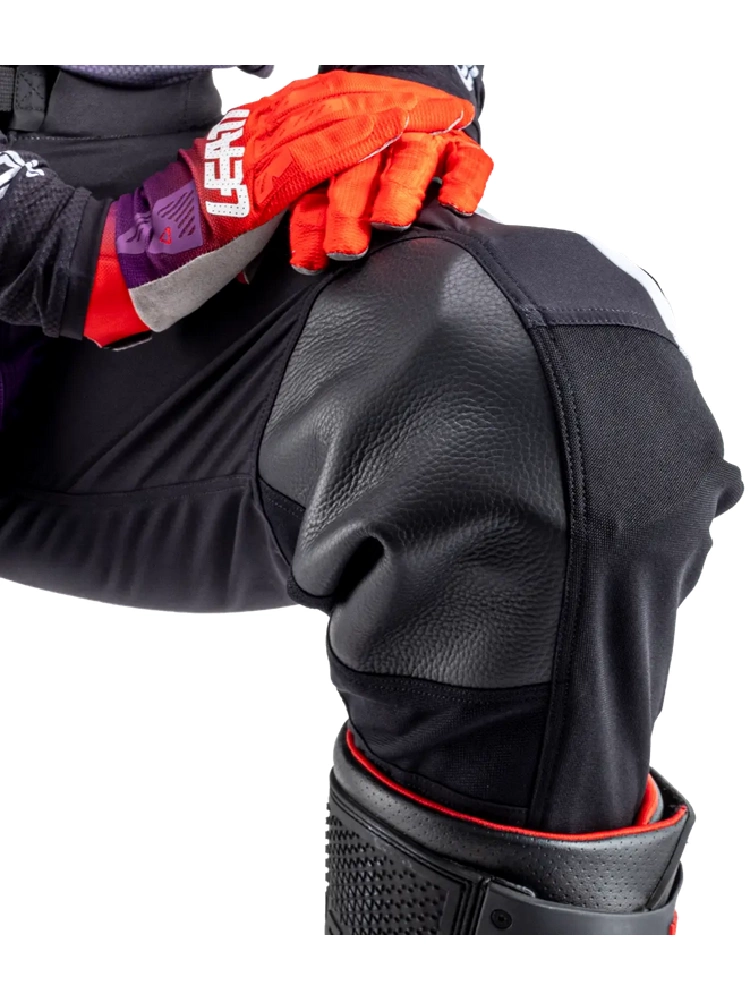 Spodnie Leatt Moto 4.5 to nowa, ulepszona wersja cenionego modelu, zaprojektowana z myślą o wymagających miłośnikach enduro i motocrossu. Aż 70% konstrukcji wykonano z elastycznego i niezwykle wytrzymałego materiału Twisted Yarn Stretch, co zapewnia swobodę ruchów oraz odporność na uszkodzenia. Wielowarstwowe panele skórzane umieszczone po wewnętrznej stronie łydek chronią przed wysoką temperaturą silnika i przetarciami, a elastyczne wstawki 900D dodatkowo zwiększają trwałość. Spodnie wyposażono w powłokę odporną na zabrudzenia, dzięki czemu łatwiej utrzymać je w czystości nawet w trudnych warunkach terenowych. System 360° Hypalon Waistlock skutecznie stabilizuje pas, zapobiegając przesuwaniu się odzieży w trakcie jazdy. O bezpieczeństwo dba także wzmocniona konstrukcja kolan 1200D, a zamek YKK z półautomatycznym blokowaniem gwarantuje pewne zapięcie. Dla jeszcze lepszej wentylacji spodnie wyposażono w laserowo wycinane perforowane wstawki, które poprawiają przepływ powietrza. Brak podszewki zapewnia lepsze dopasowanie i oddychalność, co czyni model Moto 4.5 świetnym wyborem na wymagające trasy.