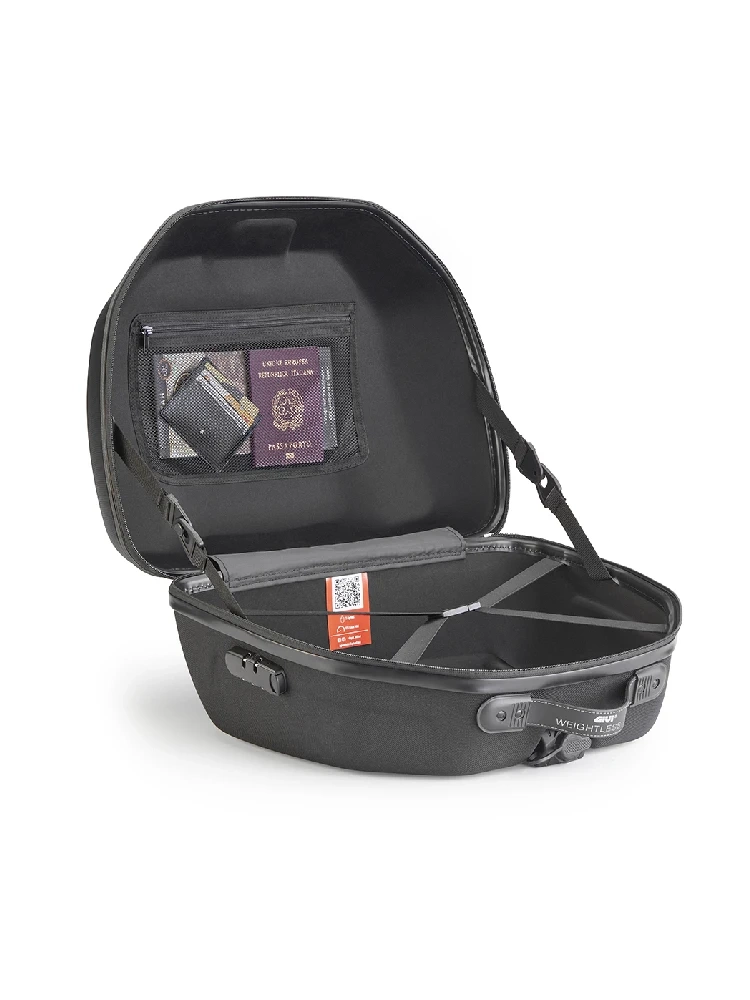 Wnętrze kufra zostało zaprojektowane z myślą o maksymalnej funkcjonalności – elastyczne paski stabilizujące bezpiecznie utrzymują bagaż nawet podczas dynamicznej jazdy, a wodoodporna, wyjmowana torba ochroni zawartość przed zmoczeniem podczas ulewnych deszczy.