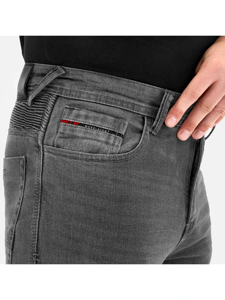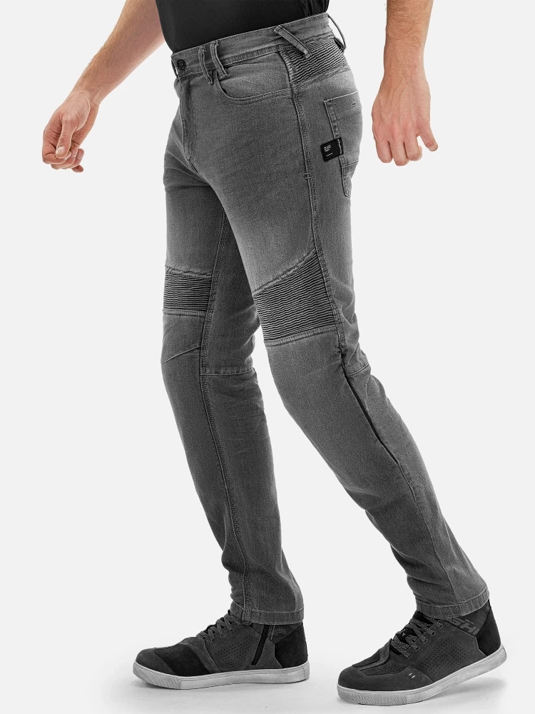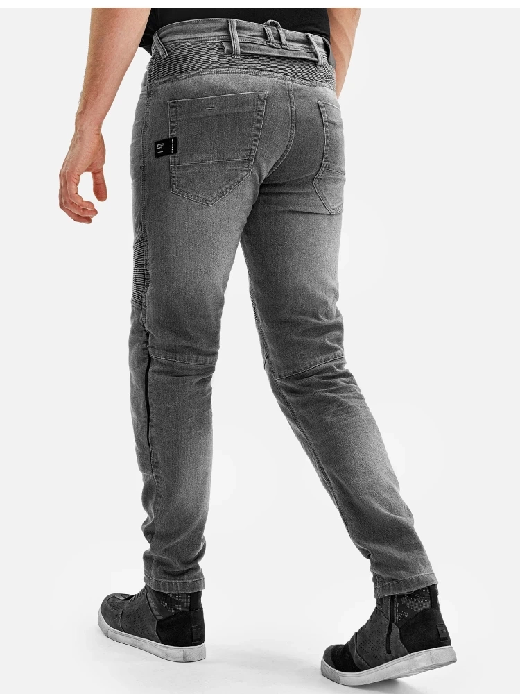 Jeansy motocyklowe Zenith wyróżniają się wytrzymałością dzięki zastosowaniu podwójnych i potrójnych wzmocnionych szwów, które gwarantują trwałość nawet w trudnych warunkach. Elastyczne panele oraz rozciągliwe wstawki nad kolanami zostały zaprojektowane z myślą o maksymalnej swobodzie ruchów i komforcie podczas długich godzin spędzonych na motocyklu.