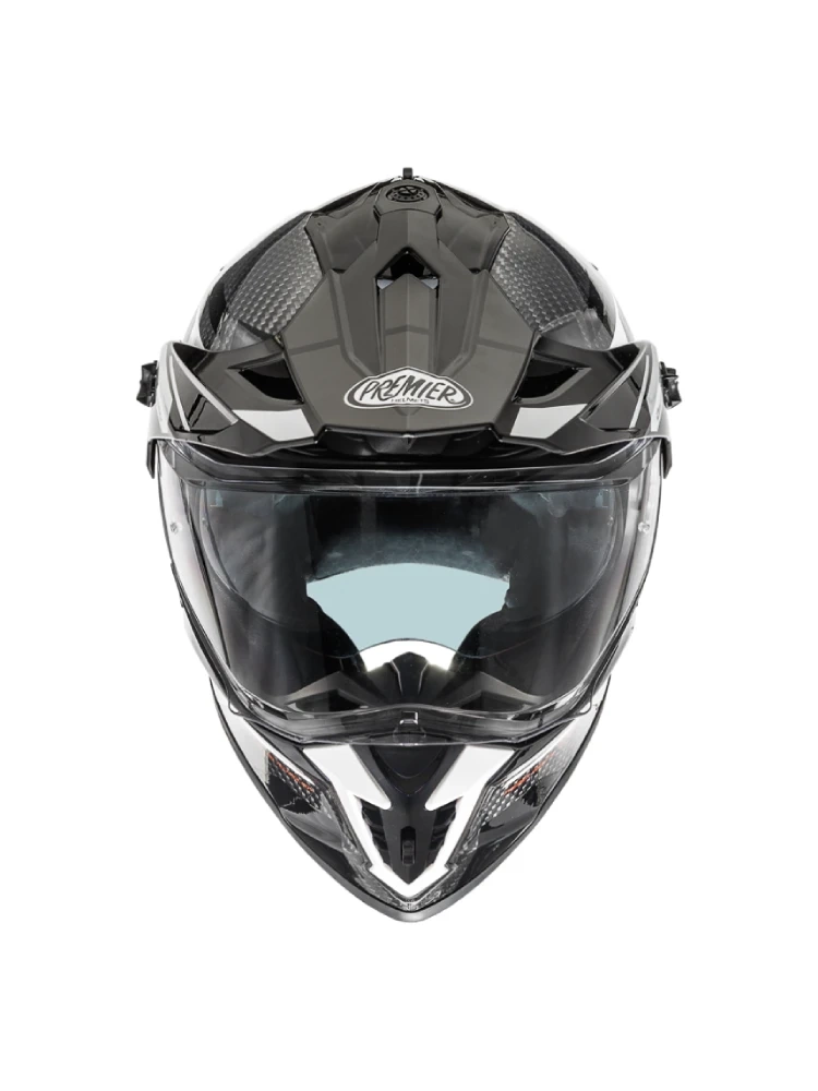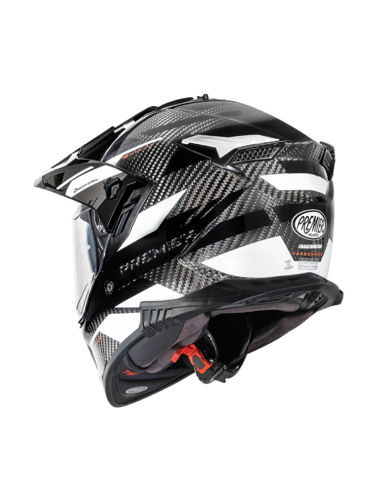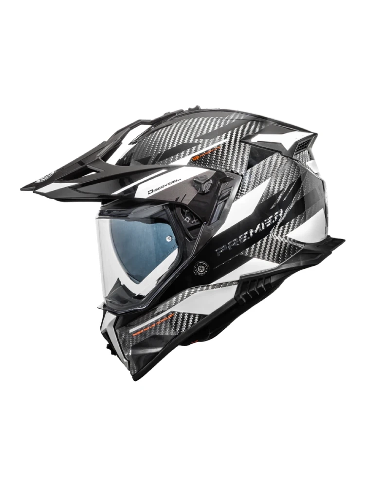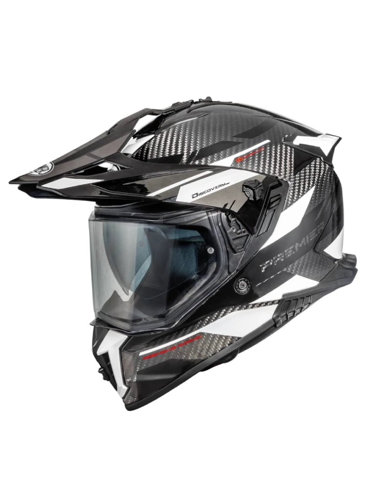Premier Discovery to kask adventure, stworzony dla pasjonatów jazdy terenowej, którzy nie boją się wyzwań terenowych i poszukują niezawodnej ochrony oraz wygody na każdym etapie swojej podróży. Wykonana z Carbonu skorupa, gwarantuje lekkość oraz niezwykły poziom wytrzymałości, co przekłada się na doskonałą absorpcję energii uderzenia. Wizjer kasku, dzięki powłoce Anti-Scratch jest odporny na zarysowania. Oprócz tego został wyposażony w filtr UV i przygotowany jest do wpięcia Pinlocka (w zestawie). Mechanizm Quick Release, umożliwia łatwą wymianę wizjera bez konieczności użycia narzędzi, co jest niezwykle praktyczne, zwłaszcza w trudnych warunkach terenowych. Kask adventure Premier Discovery posiada również zintegrowaną blendę przeciwsłoneczną. To wszystko sprawia, że zapewnia on doskonałą widoczność w różnych warunkach pogodowych. Wnętrze kasku gwarantuje nie tylko optymalną ochronę, ale także doskonały komfort użytkowania. Pianka EPS o różnorodnej gęstości idealnie dopasowuje się do kształtu głowy, zapewniając nie tylko doskonałą amortyzację, ale także efektywną wentylację i odprowadzanie wilgoci. Wypinana wyściółka z antybakteryjnego materiału pozwala na łatwe utrzymanie higieny kasku, gdyż jest przystosowana do prania. Kask Premier Discovery jest również przyjazny dla osób noszących okulary oraz przystosowany pod montaż interkomu, co sprawia, że jest to kask gotowy na wszelkie wyzwania.