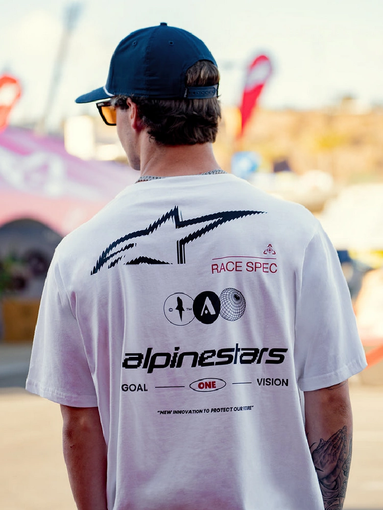 - logo Alpinestars w formie skośnego nadruku gradientowego z folii na przodzie oraz grafika słowna na plecach,