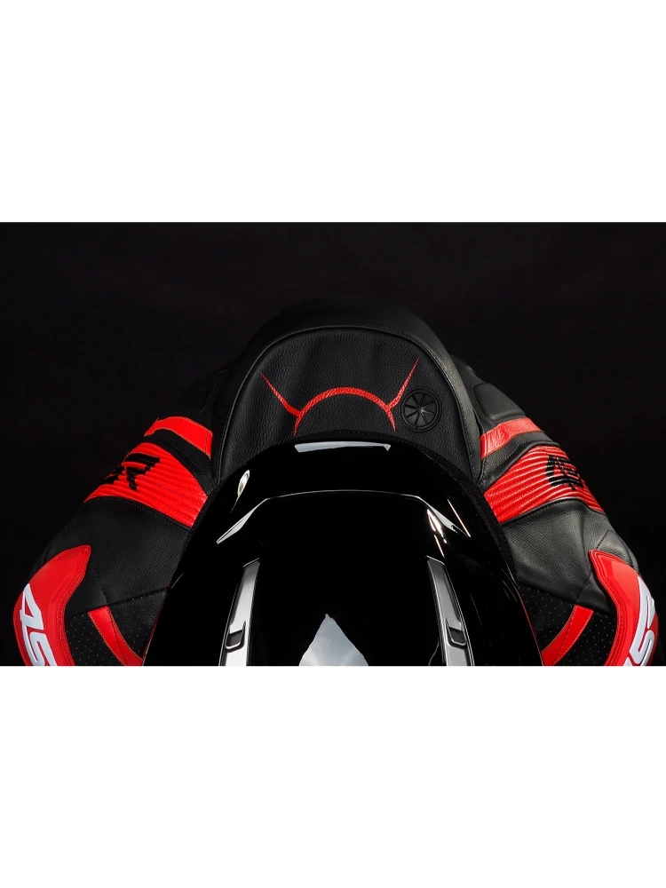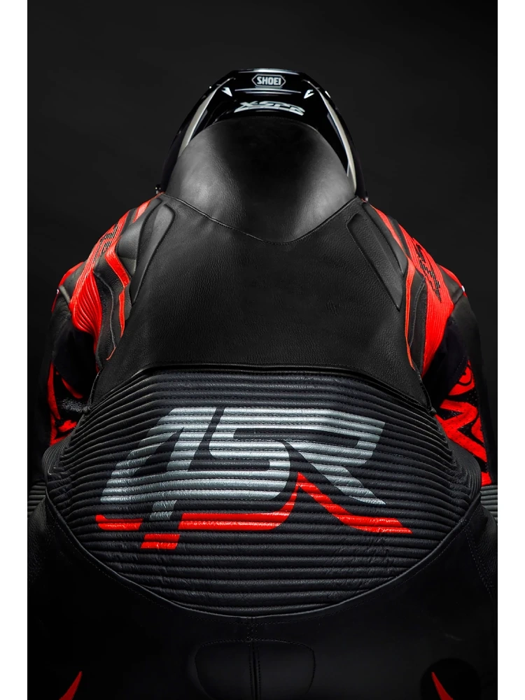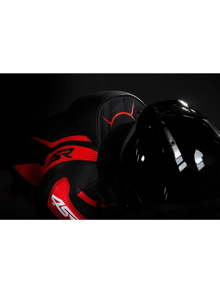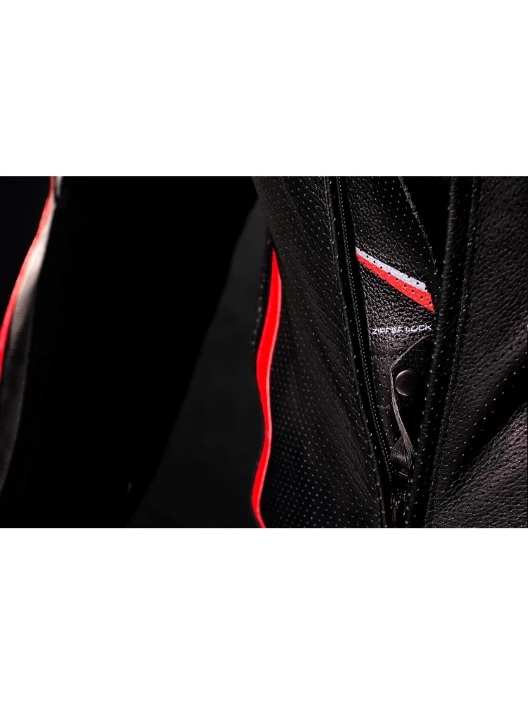 Kombinezon motocyklowy 4SR Racing AR gwarantuje świetne doznania oraz optymalne warunki bezpieczeństwa podczas jazdy na torze. Jednoczęściowa konstrukcja zapinana na zamki YKK i OPTI sprawia, że zakładanie oraz zdejmowanie trwa dosłownie kilka chwil. Do produkcji kombinezonu zastosowano odporną na przetarcia oraz przebicia skórę bydlęcą o grubości 1,2 mm. Kluczowe obszary o wzmożonym obciążeniu wsparte zostały potrójnymi szwami. Liczne strefy perforacji zastosowane na rękawach, biodrach i udach umożliwiają swobodny przepływ powietrza oraz szybkie odprowadzanie wilgoci, będącej przyczyną powstawania nieprzyjemnych zapachów. Elementy z aramidowego stretchu zwiększają naszą mobilność ułatwiając między innymi wsiadanie na motocykl oraz przyjęcie dogodnej pozycji w trakcie jazdy. Świetne dopasowanie kołnierza oraz mankietów chroni przed wiatrem powstającym podczas dużej prędkości, osiąganej na torze. Za bezpieczeństwo odpowiadają kompleksowo rozmieszczone protektory z certyfikatem. Ochraniacze Betac zadbają o bezpieczeństwo naszych ramion, łokci i kolan. Do dyspozycji mamy również wymienne slidery 4SR Elbow down TECH oraz protektor klatki piersiowej i pleców. W tylnej części znajduje się aerodynamiczny garb umożliwiający korzystanie z camelbaga. Wnętrze wyściełane zostało miękką i komfortową podpinką 3D.