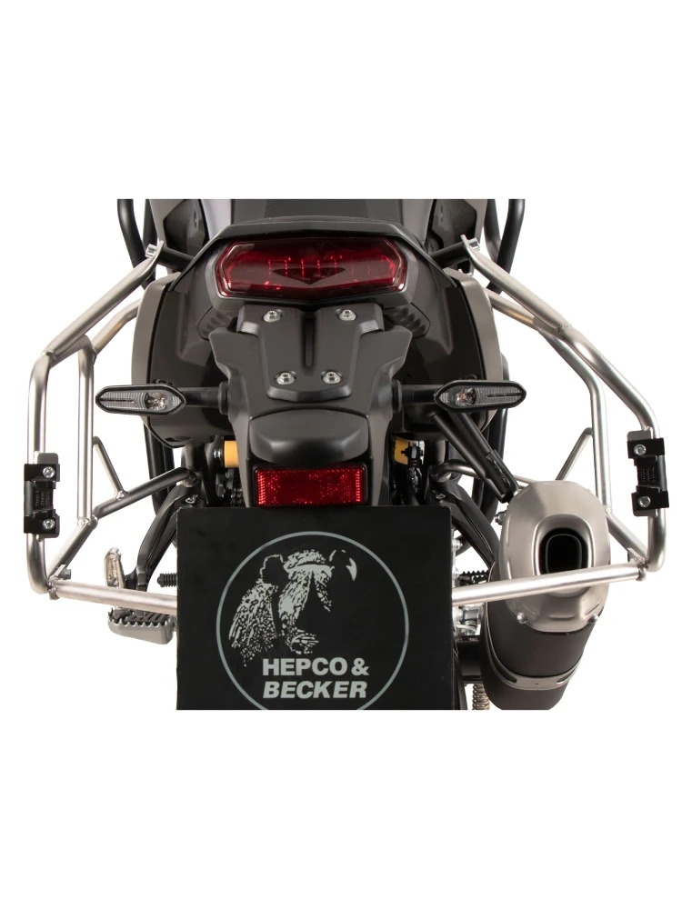- Zestaw kufrów bocznych Xplorer Cutout wraz ze stelażem bocznym (na prawą i lewą stronę) ze stali nierdzewnej