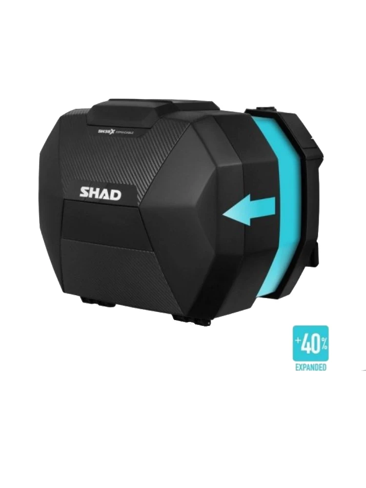 Dzięki teleskopowemu mechanizmowi kufer SHAD SH38X zwiększa swoją pojemność o 40% – idealnie na dłuższe trasy lub zawsze wtedy, kiedy potrzebujesz więcej miejsca na bagaże. Po rozszerzeniu z łatwością mieści szczękowy kask w rozmiarze XL.