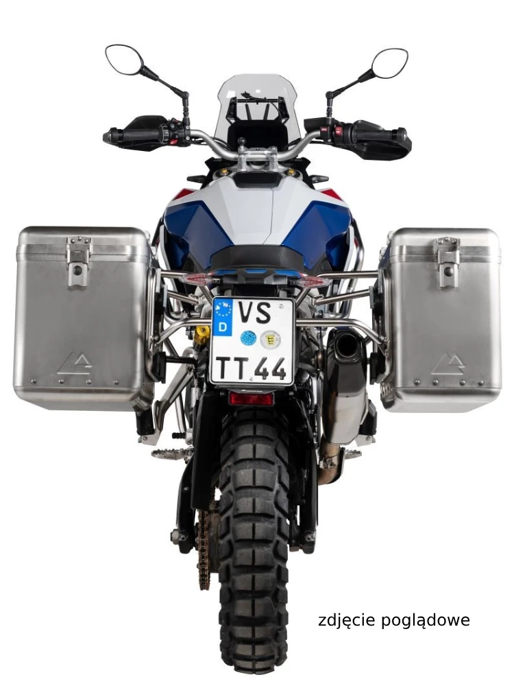 Zestaw: kufry boczne srebrne Zega Mundo + stelaże czarne Touratech BMW F 900 GS (24-) [poj.: 31+38l]