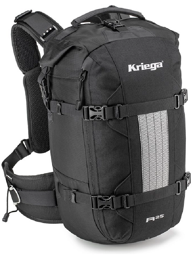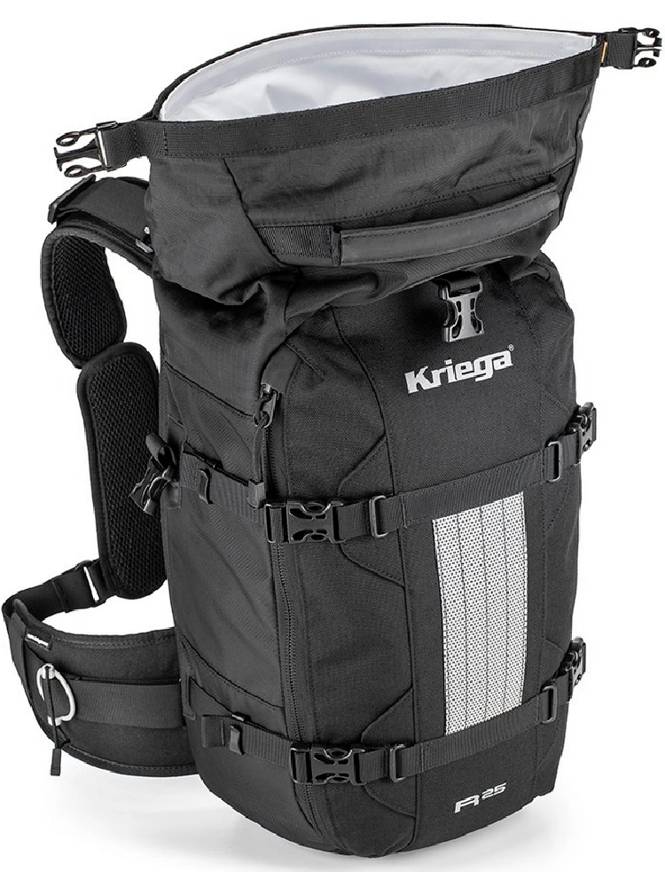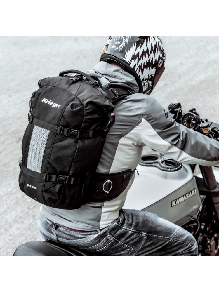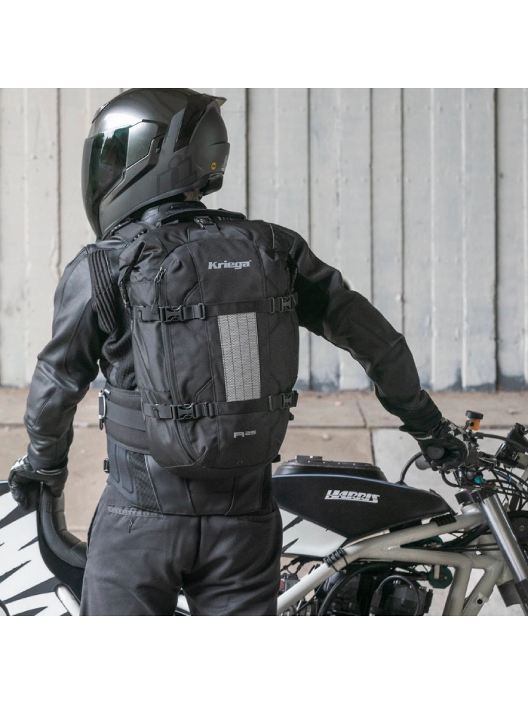 Plecak posiada charakterystyczne aluminiowe regulatory Kriega, które ułatwiają idealne dopasowanie w pasie i eliminują problem zwisających pasków. Cztery boczne paski kompresyjne stabilizują ładunek podczas dynamicznej jazdy, a tylna wyściółka z materiału Superspace zapobiega punktowym naciskom i zapewnia doskonałą wentylację. Dodatkowo Kriega R25 jest kompatybilny z systemem hydracyjnym oraz ochraniaczem pleców, a także umożliwia rozbudowę o kieszeń na szelkę i inne akcesoria.