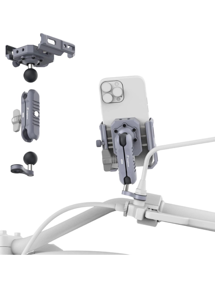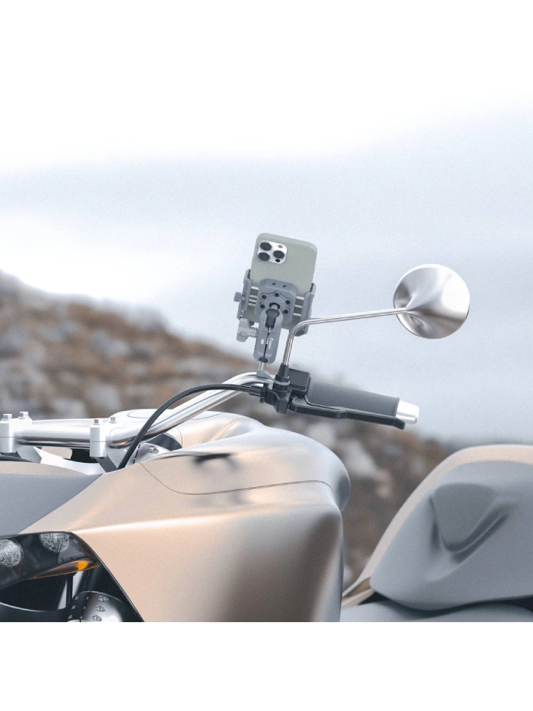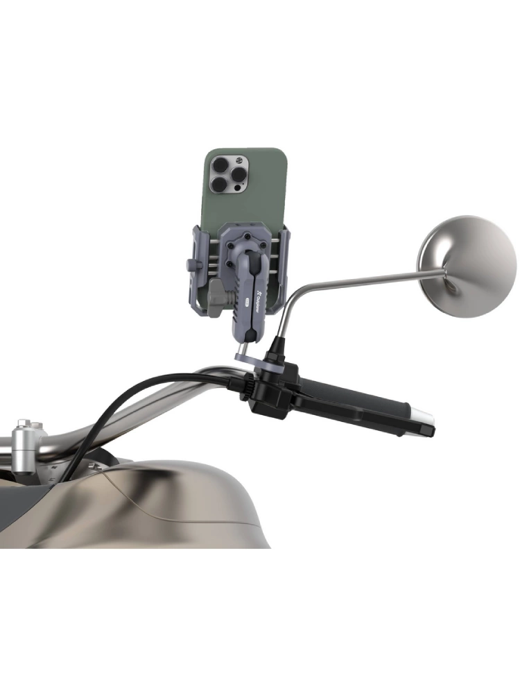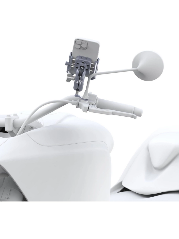 - uchwyt do telefonu z montażem przy lusterku – przeznaczony do instalacji na ramieniu lusterka wstecznego motocykla lub skutera; umożliwia wygodne i stabilne umiejscowienie telefonu w zasięgu wzroku kierowcy,
